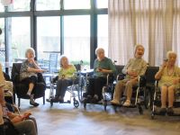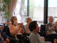 本日は皆さんが楽しみにしている音楽療法です。『世界の国からこんにちわ』の替え歌から始まり、夏にちなんだ歌を多めに演奏して頂きました。利用者様が簡単な振り付けを練習し、身体を動かしながら歌ったり、楽器を振りながら歌ったりと、あっという間に1時間がたちました。来月も楽しみにしていて下さい(^-^)