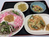 献立のメニューは、天ぷら盛合わせと湯葉のカニカマあんかけ、ほうれん草の和え物にフルーツ付きです。