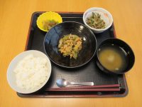今日のランチメニューは、ご飯・なめこのお味噌汁・焼肉・ナムル・煮豆でした。