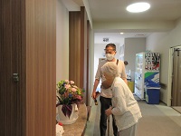 入居される前の病院では、ほとんど歩ける状態ではなく過ごされていた方です。入居されて少しずつ歩く回数が増えていき、今日はご家族様と近くのスーパーまで歩いていかれました!