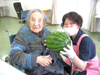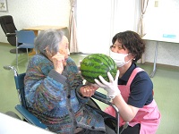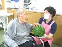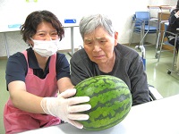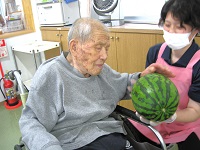 今日は夏の風物詩でもあるスイカ割りを行いました。皆様