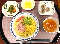 献立メニューは、ポークソテーデミグラスソースとマカロニソテー、かぶとツナのサラダにフルーツ付きです。