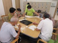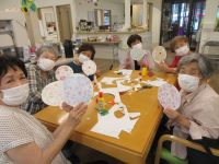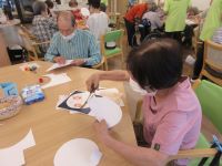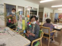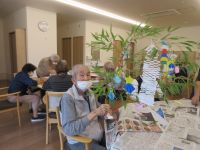 こんにちは、デイサービスです。本日は昨日の壁面制作のつづきを行いました。今日の皆様には青空をちぎり絵で作って頂きました。「白いところがあるよ」「真っ青な空にしようね」と真剣に空色の折り紙を貼って下さったおかげでとても綺麗な空が完成しました。有難うございました。