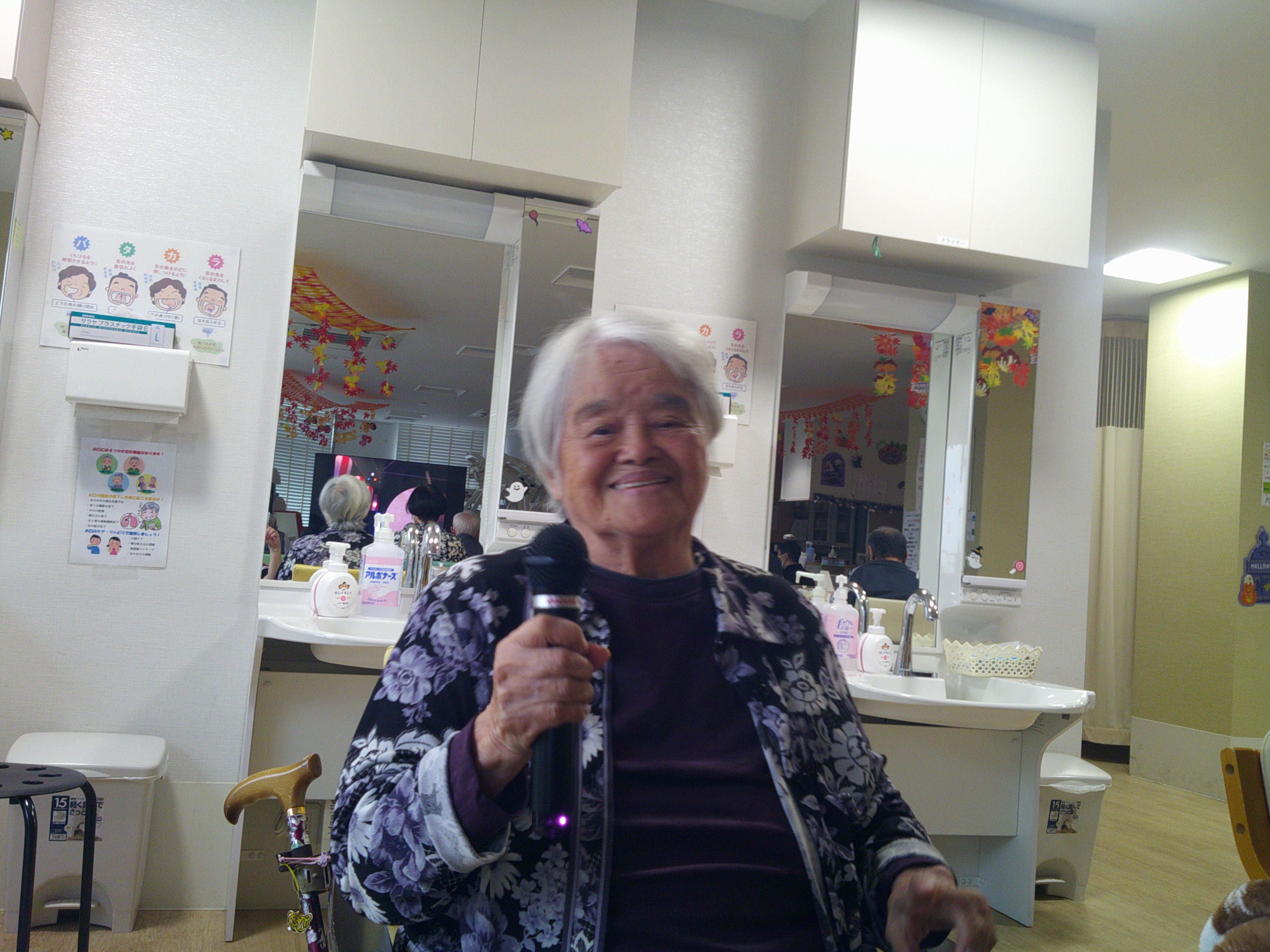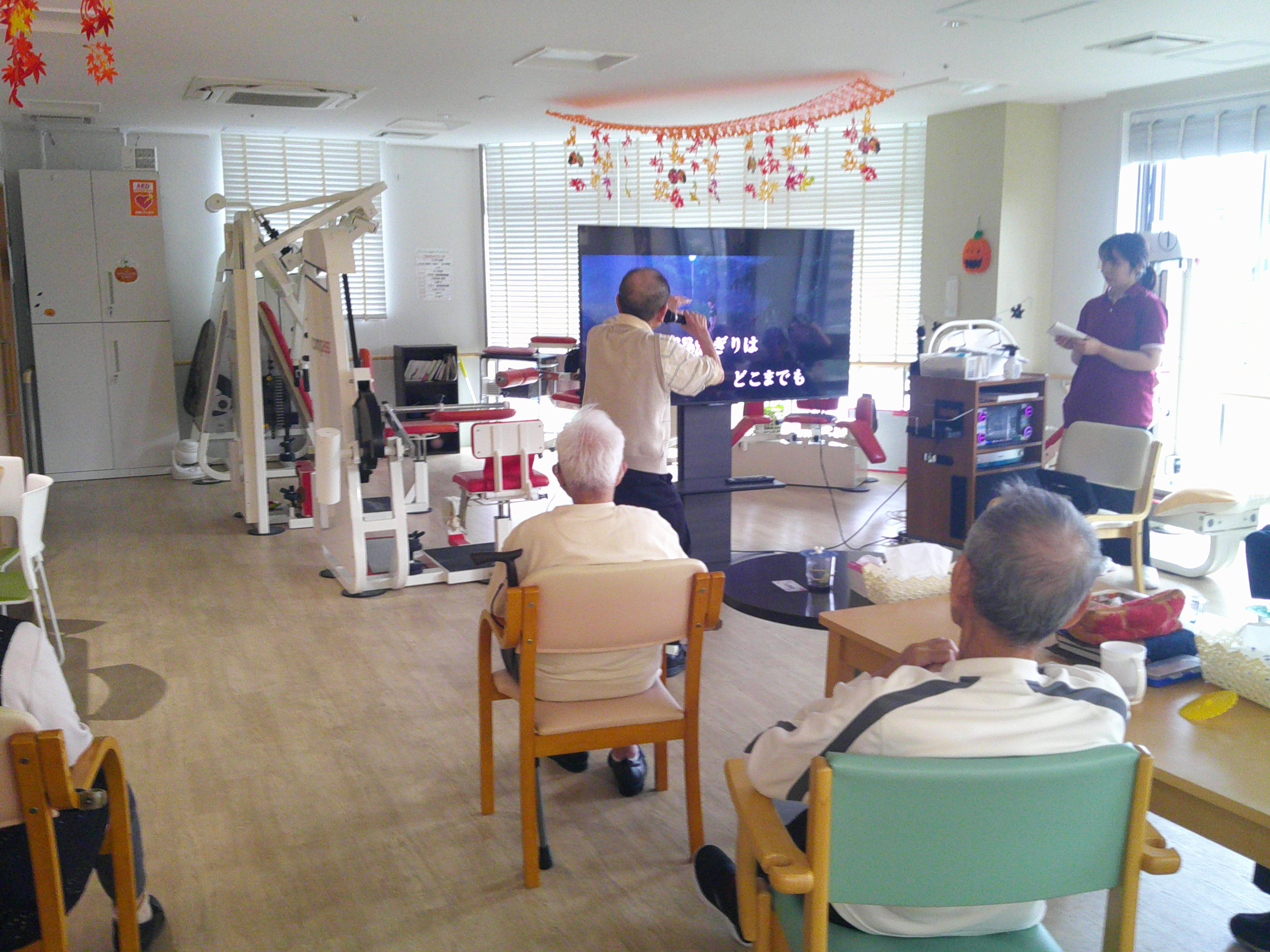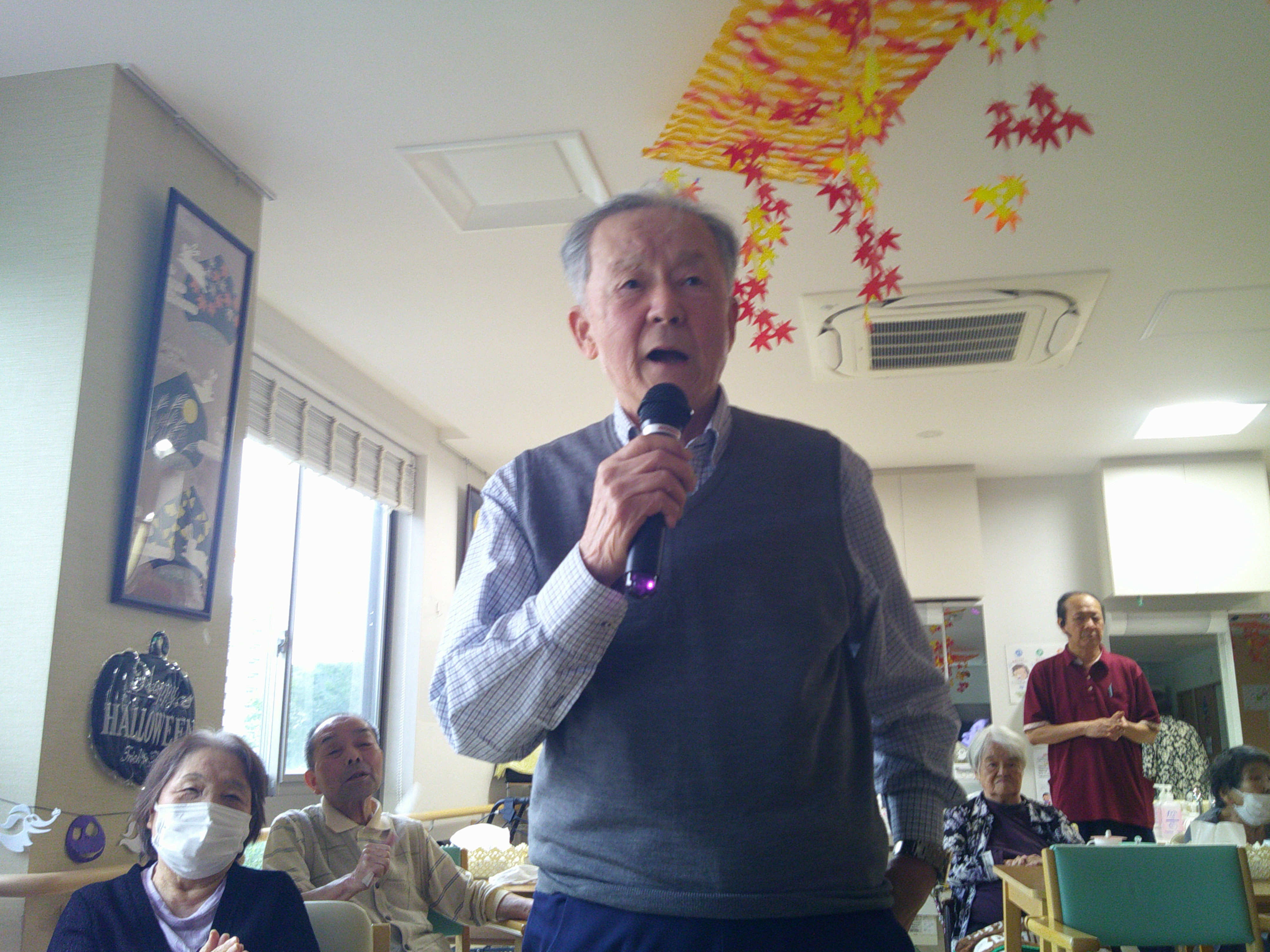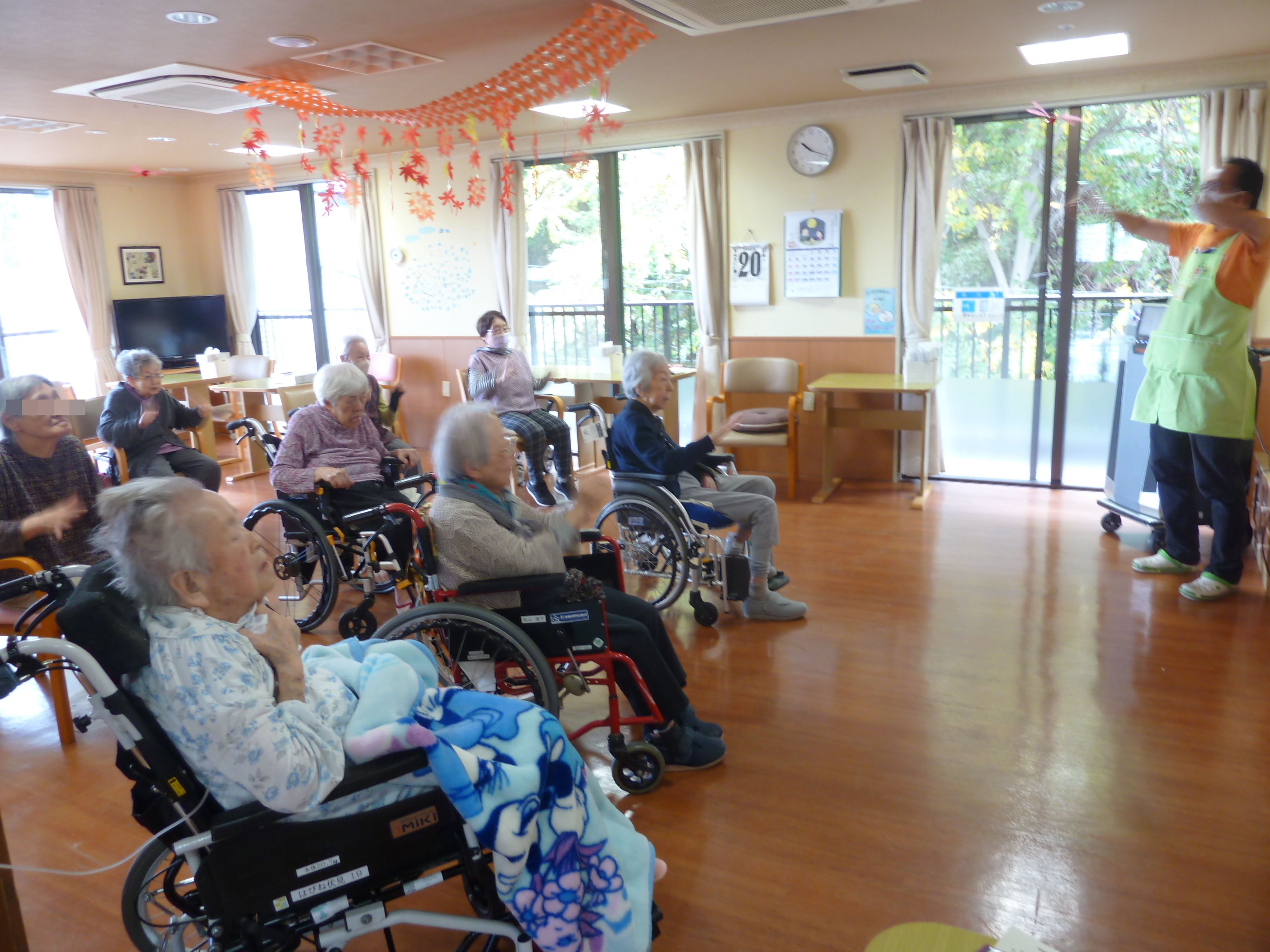 こんにちは、シーハーツ柏です。 文化の秋と言えば、歌です。 今週も音楽療法の時間がやってまいりました。「月がわびしい 路地裏の~」 「チャンチキおけさ」入居者様にとって馴染みがある曲ですね。 急に寒くなってきましたので、声を出して歌うことで、身体もポカポカ。先生とのコミュニケーションも積極的に取られる姿も見られました。音楽療法の時間は、入居者様にとって毎月の楽しみとなっています。
