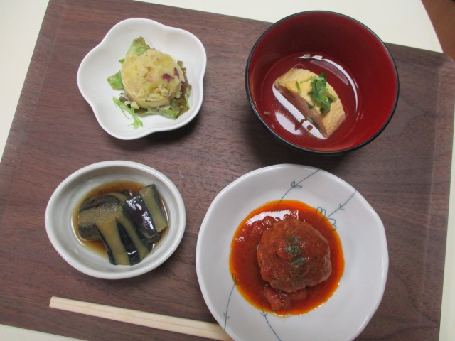 献立のメニューは、豚肉の玉葱ソースと里芋のみそ田楽、モロヘイヤの和え物です。