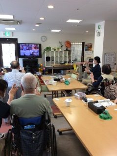 今日は【音楽療法】の日です♬たくさんのご利用者様が参加されました!!きょうは皆様、とっても声が出ていて素敵な歌声がフロアに響いていました(*^-^*)スタッフとご利用者様が手拍子で盛り上げ楽しいひとときを過ごしました(^^♪