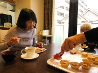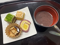 数種類の小さなサイズのケーキと、冷やしぜんざいが