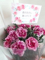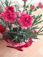 今日も遠く離れた息子さんから可愛らしくアレンジされた真っ赤なカーネーションが届きました。