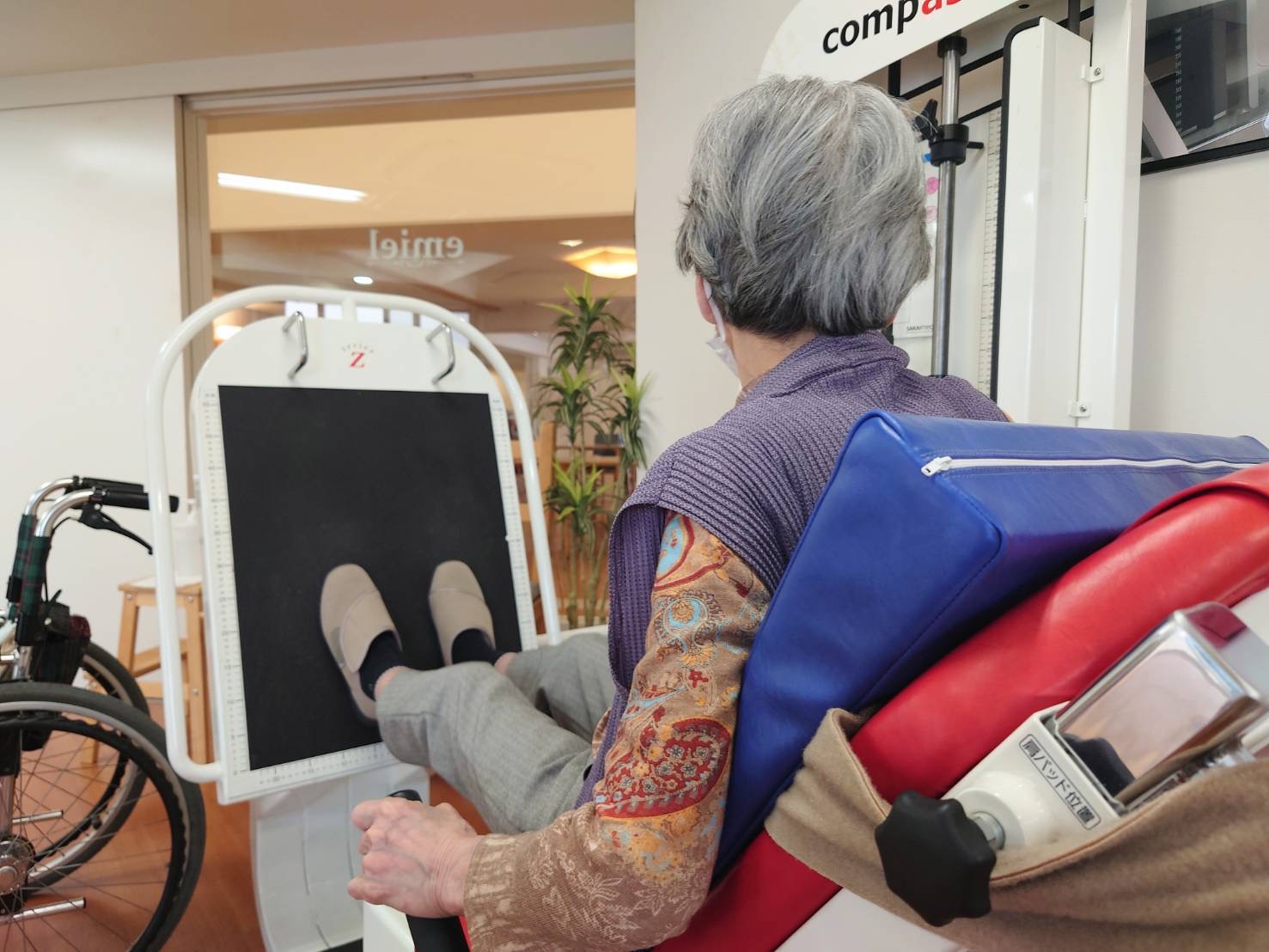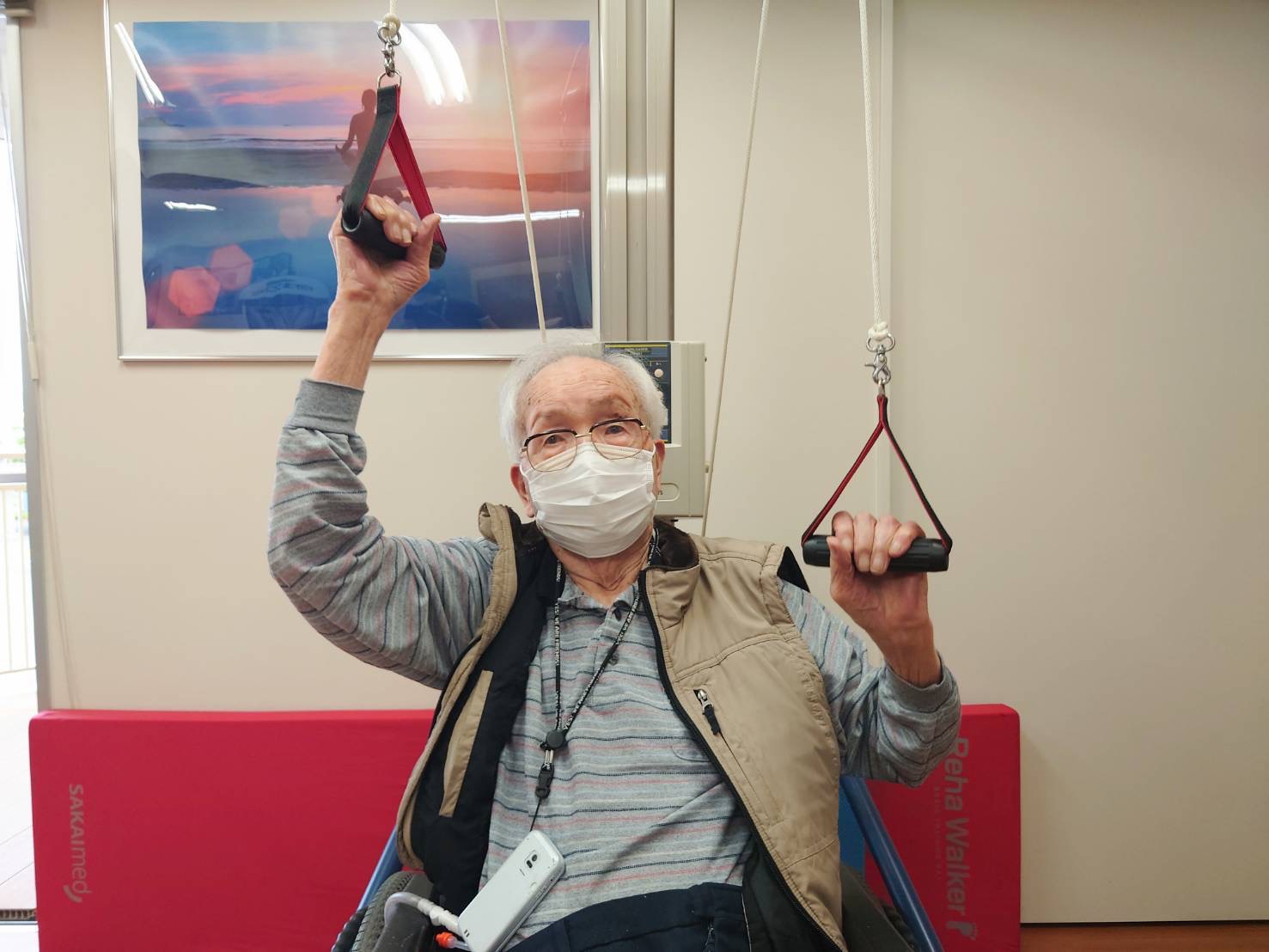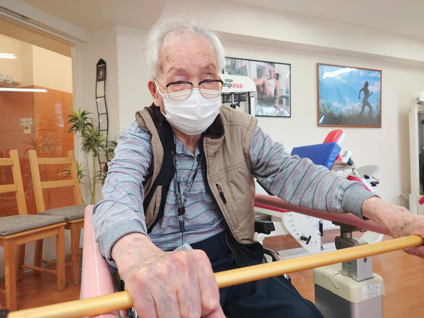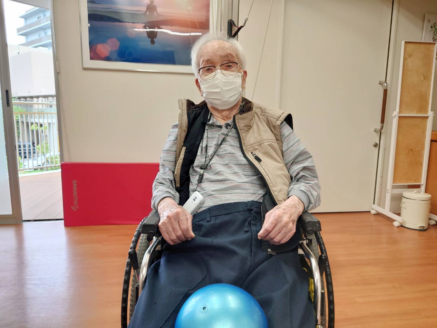 1階のラウンジで何やら遊んでいる佐藤施設長。