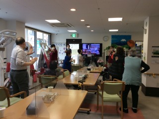 1階のラウンジに来ていただき召し上がる前に施設長と歌いながら体操をしていただきました。