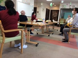 今日は、皆様で輪投げをしました。先ずピンに10点、20点、50点と書き、それにペットボトルが5点!これで点を競います。これがなかなか難しい!50点を狙って5点に入ったり、逆に5点を狙って50点に入ったり・・最後に職員もしましたが点が入らず0点だった職員もいたりと皆様で笑いながらのゲームになりました(^_-)-☆楽しかったですね(^-^)