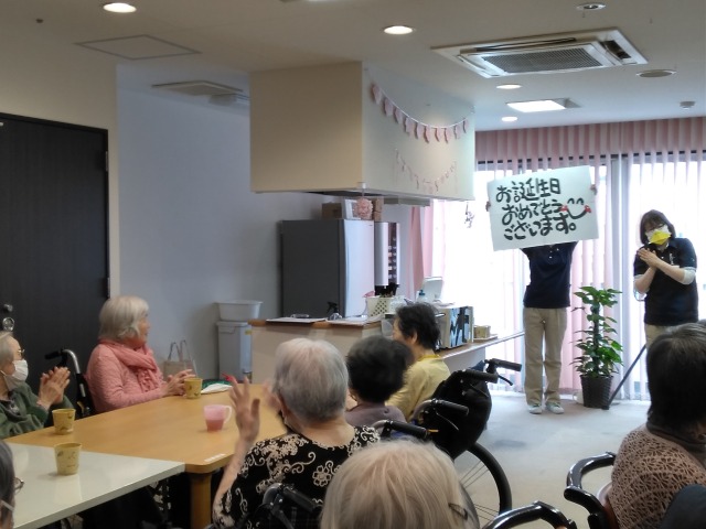 今月のお誕生日はお一人のみでしたが、たくさんの入居者様がご参加くださいました。
