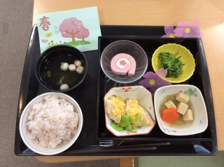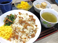 予告の写真ではごはんの上にお肉と卵と青菜が三色丼のようになっていましたが、「まんべんなく味が楽しめるように」と調理スタッフさんの計らいで混ぜご飯っぽくなっていました(^^♪