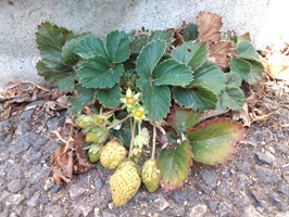 アスファルトと建物の隙間からイチゴが育っています。