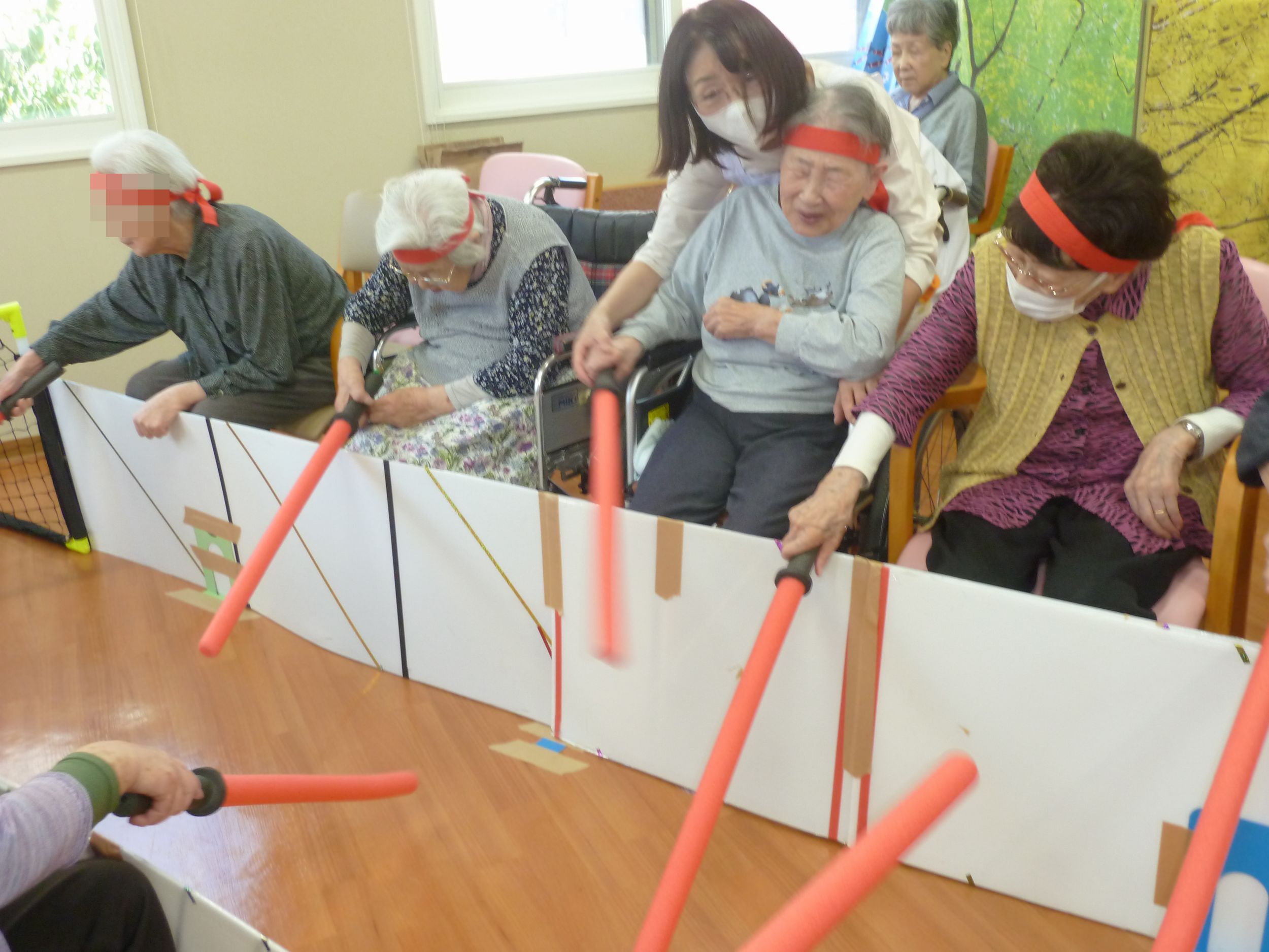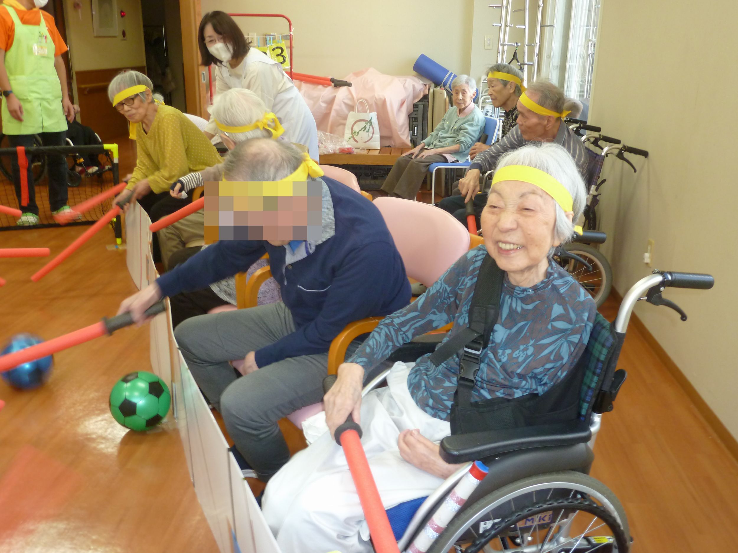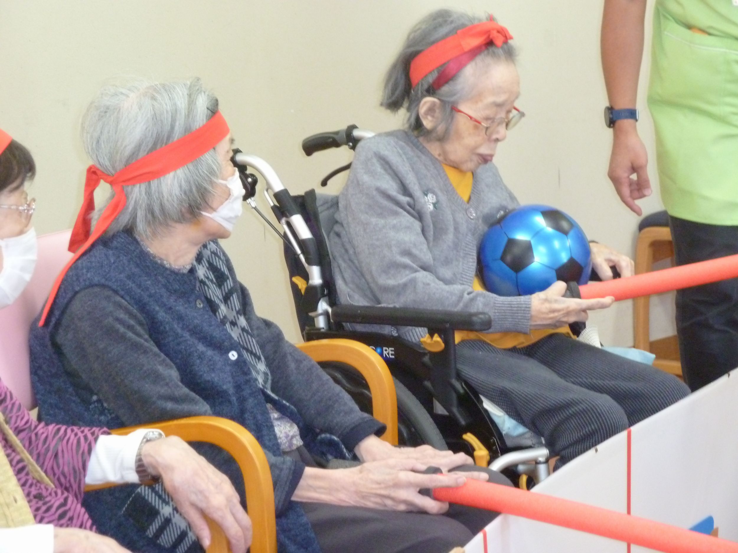 力強くボールを叩きすぎて、反対の列の入居者様の腕の中にスッポリ入ってしまうという珍事件(笑)