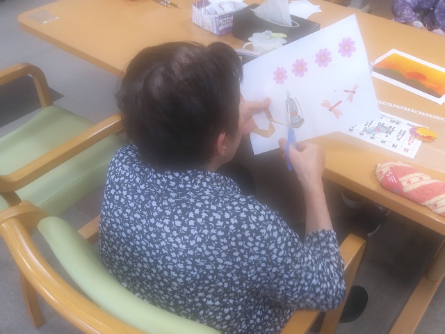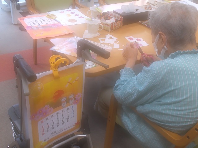 こんにちは、シーハーツ柏です。「今、オレンジ色のコスモスが咲いてるの。よく見ますよ。」と、ケアスタッフから話題が出たので、入居者様が塗り絵のコスモスをオレンジ色にアレンジしてくださっています。私はまだ、オレンジ色のコスモスを見たことがありません。その後、「オレンジ色もいいけど、やっぱりコスモスはピンクがきれいね。」と、スタッフより。((笑) 秋を感じます。