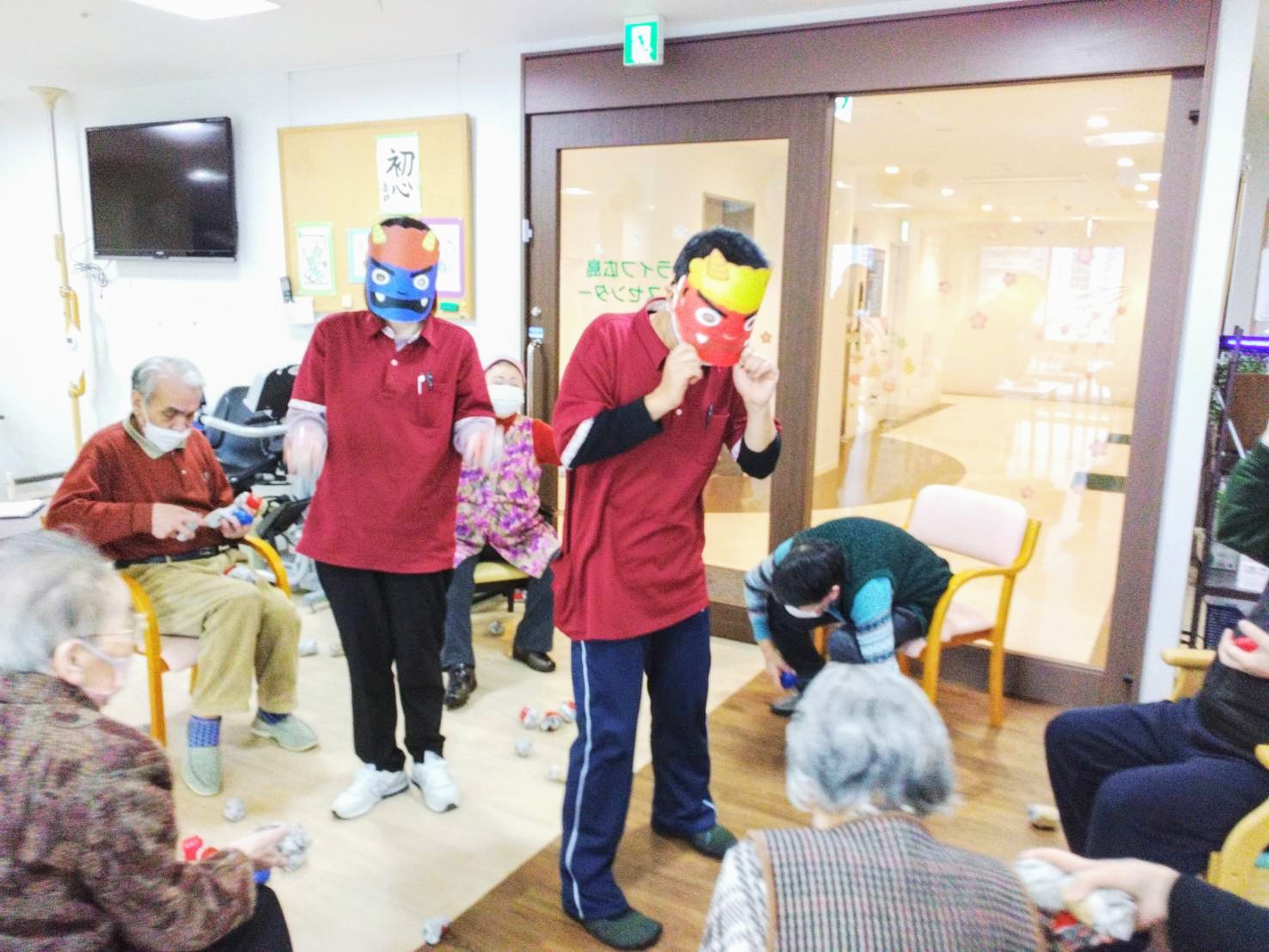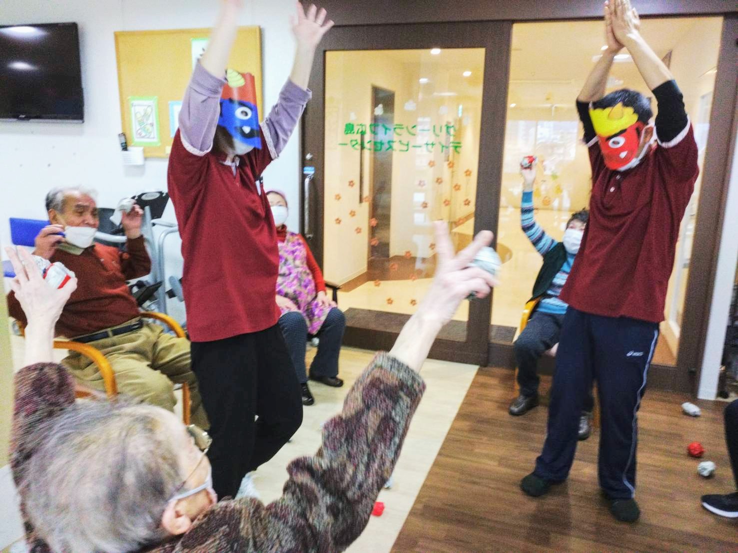 鬼がやってきました!! 皆でとりゃっ!と退治するかと思いきや、とっても可愛らしい鬼といっしょにピース(^^)v や金棒を持ってぎゅーとする方までいらっしゃいました♪お昼ご飯は恵方巻を美味しく頂き可愛い鬼に変身した方もいらっしゃり節分を満喫して頂きました(^^♪