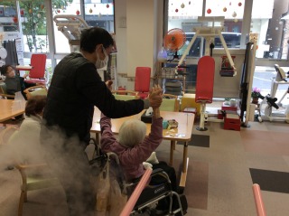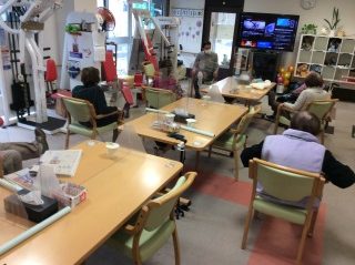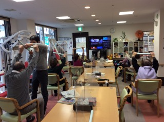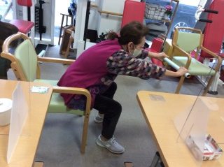 施設内を歩いたり、手すりを使ってストレッチをしたり、椅子に座ってオリジナル体操をしていらっしゃいます。