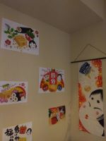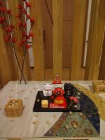 帯は踊りをやっているSさんが何本も持ってきてくれて重宝しています。お正月飾りが華やかだったので、赤の帯を使ったら見栄えが良くなりました。升もSさんに借りました。皆様に季節感を感じていただけたらと思います👹