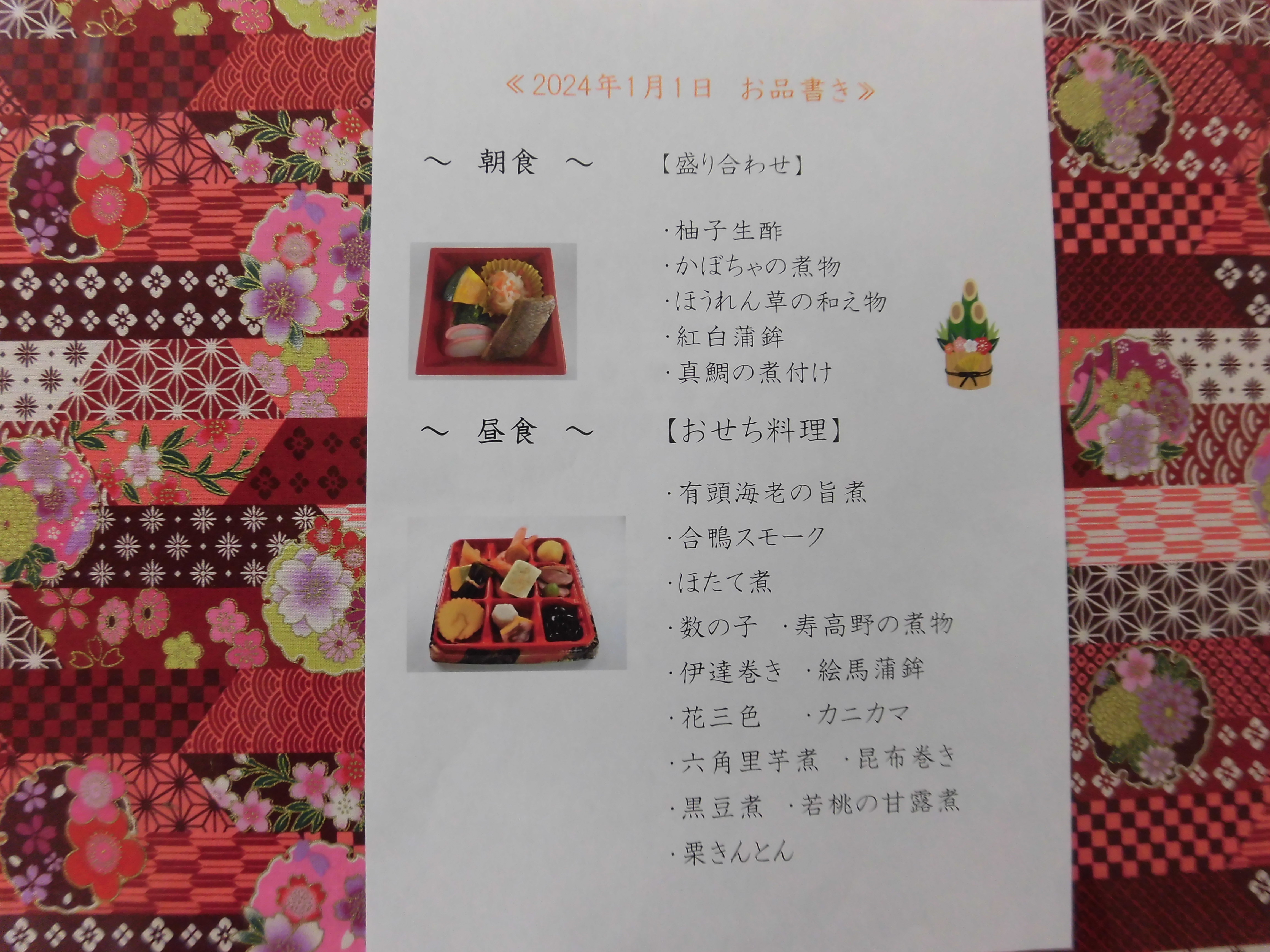 今年も元旦の朝食と昼食におせち料理が振舞われました。お品書きと画像を載せます。