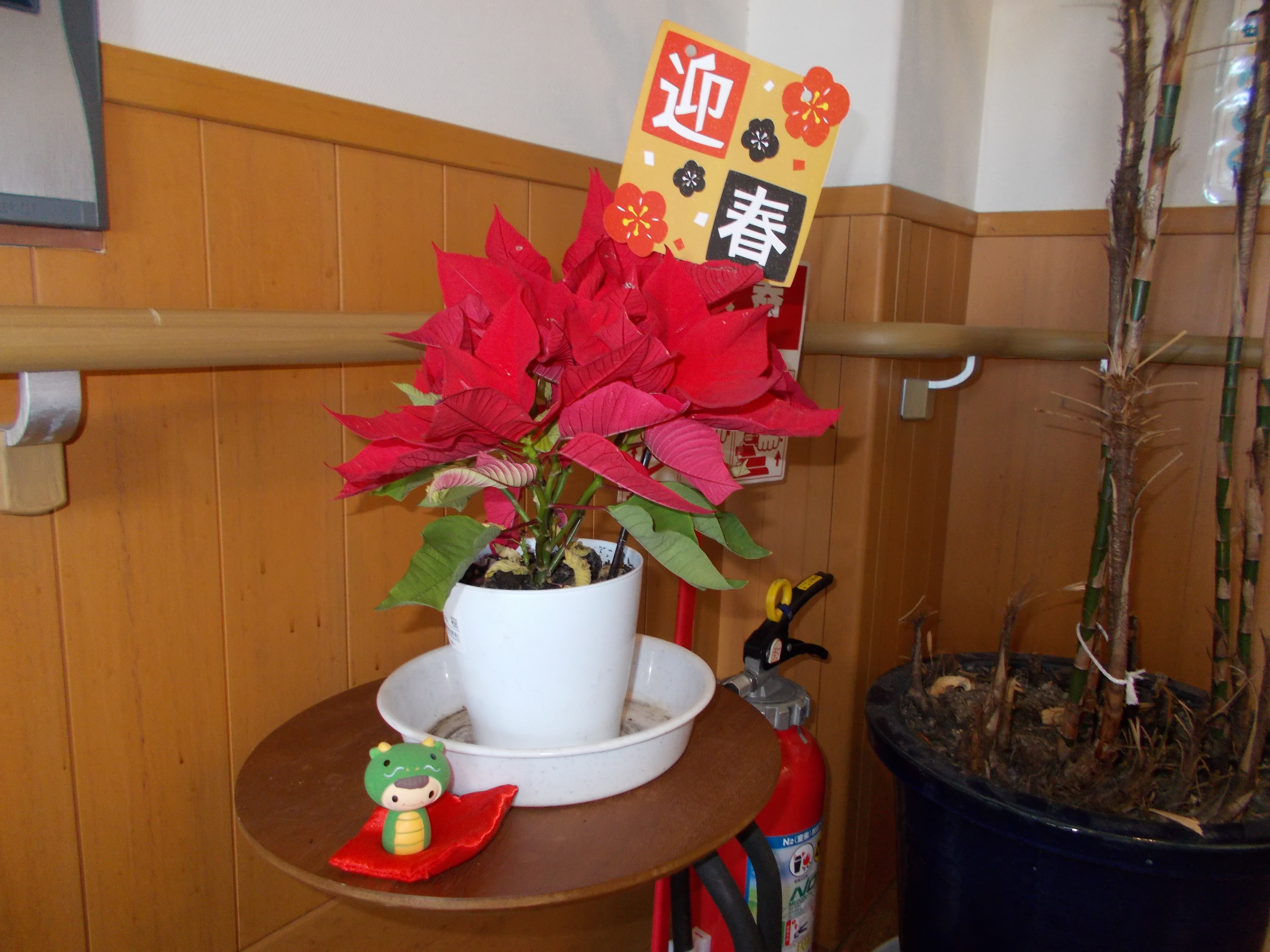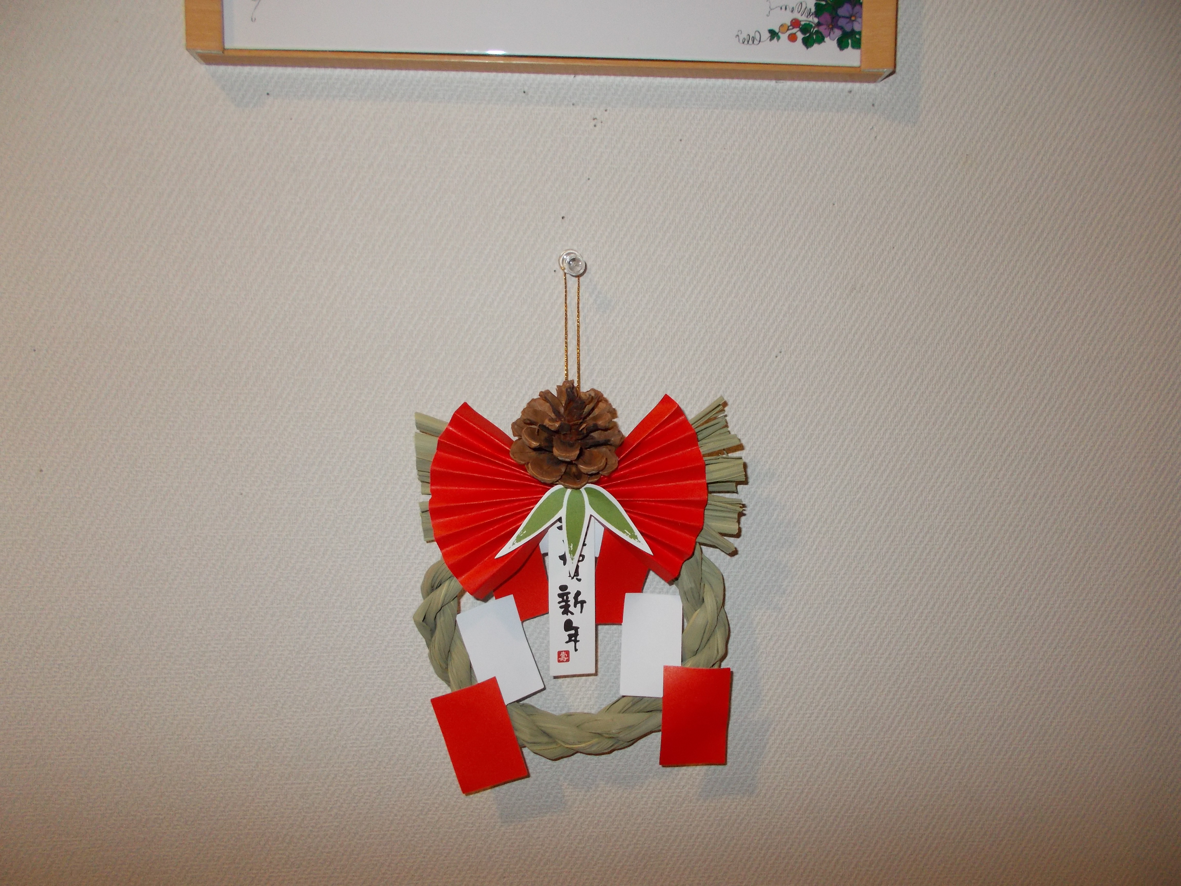紅白の梅だったり、花も飾って、各部屋前にはミニお飾り。