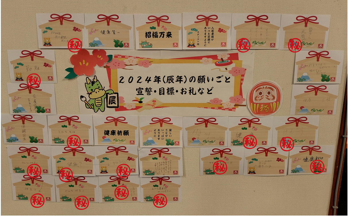 今年の願い事を入居者様に絵馬へ書いていただきました。