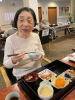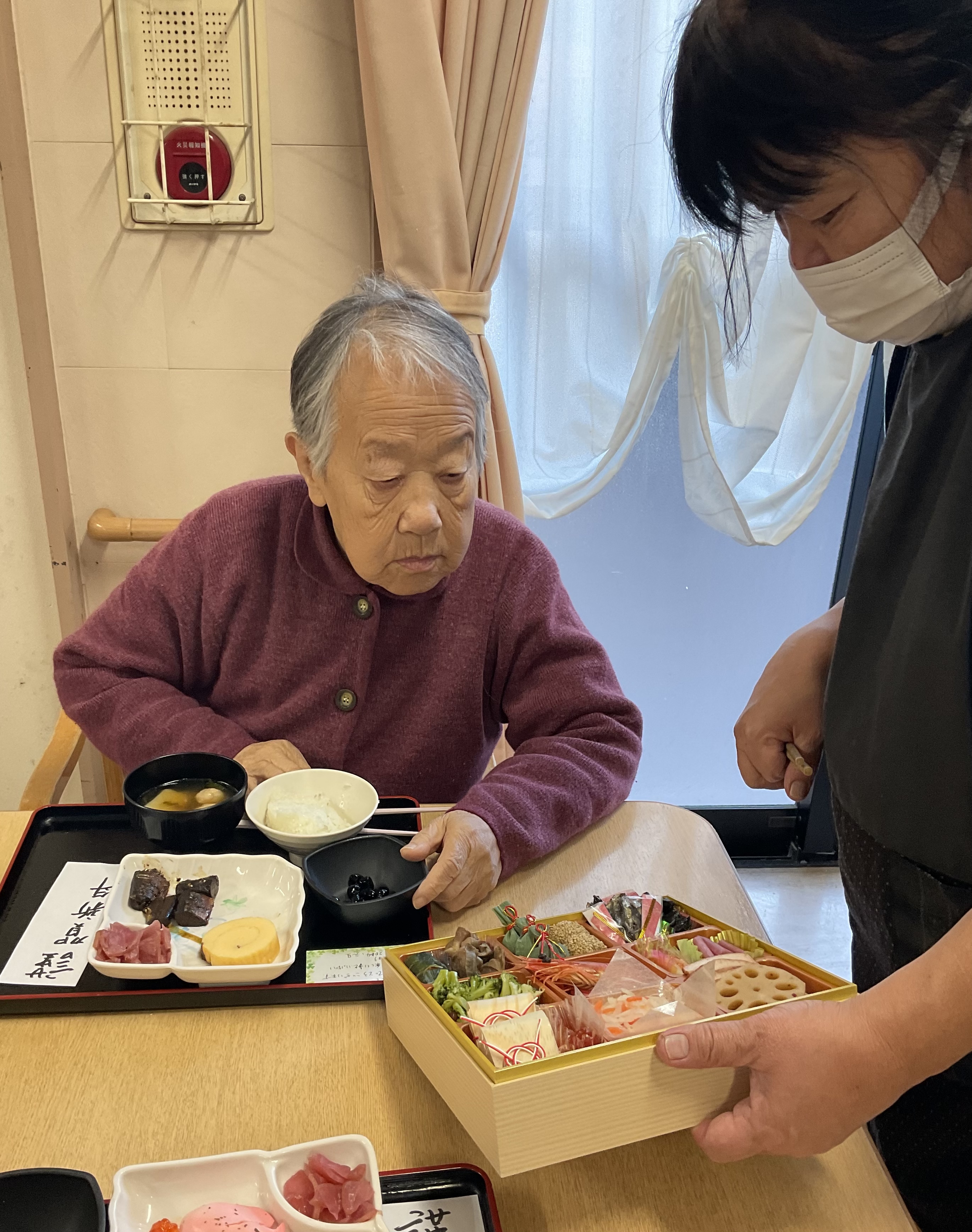 ご利用者の皆様に、朝日を拝んでいただき、新年を迎えていただきました。今年は、本社より、三段重のお節が届きました。美味しそうなものを選んでいただき、食事に添えていただきました。昨日の大晦日は、遅くまで皆さんとテレビを見て過ごされ、ちょっと寝不足のようでしたが、記念撮影をしたり、歌を歌ったりとお元気に過ごされました。