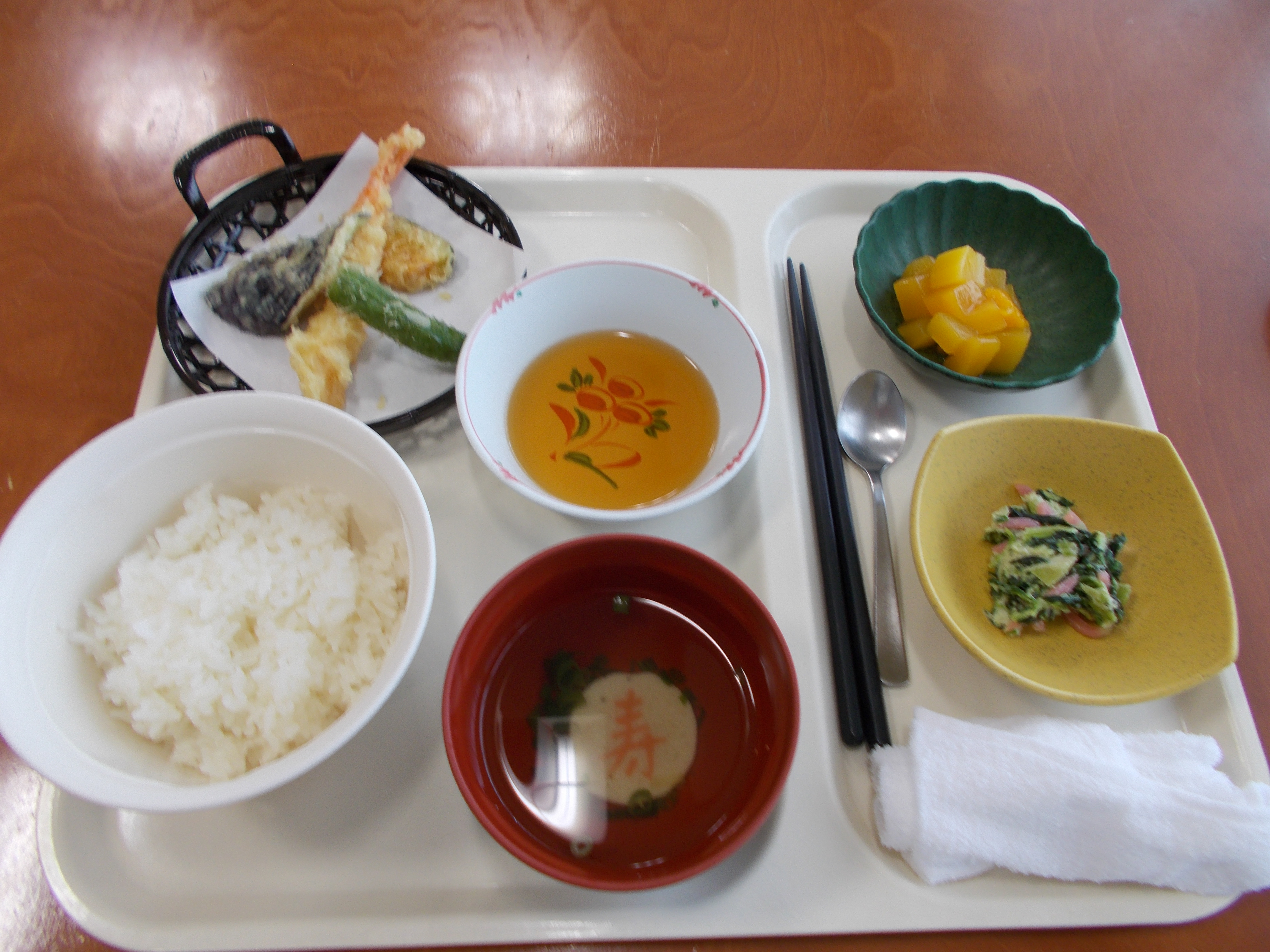 お昼は、天ぷら盛合せ。すまし汁のお麩もかわいい。