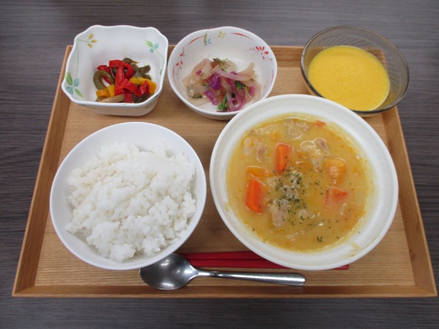 昼食も今日はかぼちゃメインの豪華なランチでした♬皆様特にシチューをおいしそうに召し上がっておられ、普段、食の細いご利用者様も見事完食されていました( *´艸`)寒くなってきたので、温かいシチューで身も心もほくほくされたことでしょう✨✨デザートはかぼちゃプリンでした🌟