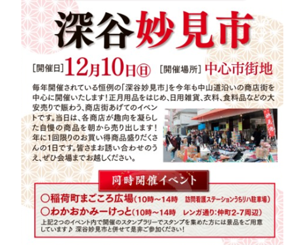 毎年12月10日が深谷妙見市開催日で今年は日曜日に当たるので、同時開催のイベントもあるようです。