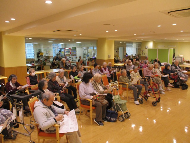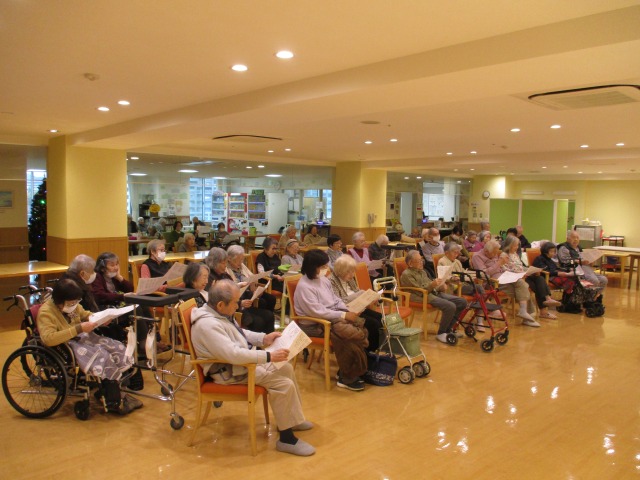 こんにちは、シーハーツ柏です。 音楽療法を担当してくださっているLeaf音楽療法センターの河口先生。12月になり、「たきび」や「冬景色」など、季節にぷったりな選曲で合唱しました。「冬空は空気が澄んで星がきれいに見えますよね。」と、先生がおっしゃるように、冬は「寒い」だけではなく、たくさん良いこともありますね。さらに、入居者様もおなじみの名優たちも登場するような歌で盛り上がりました。 初めて参加された入居者のK様が、河口先生が帰られる際に、「すごくきれいな声で、歌も良かったです。またお願いしますね。」と、先生の歌声に魅了された様子でした。次回も楽しみですね。