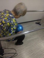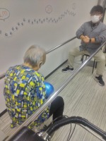 グーっと下肢に力が入っていますが、上体はお手透きですので、機能訓練指導員と楽しくお喋りしながら、あっという間の時間だったようです〜