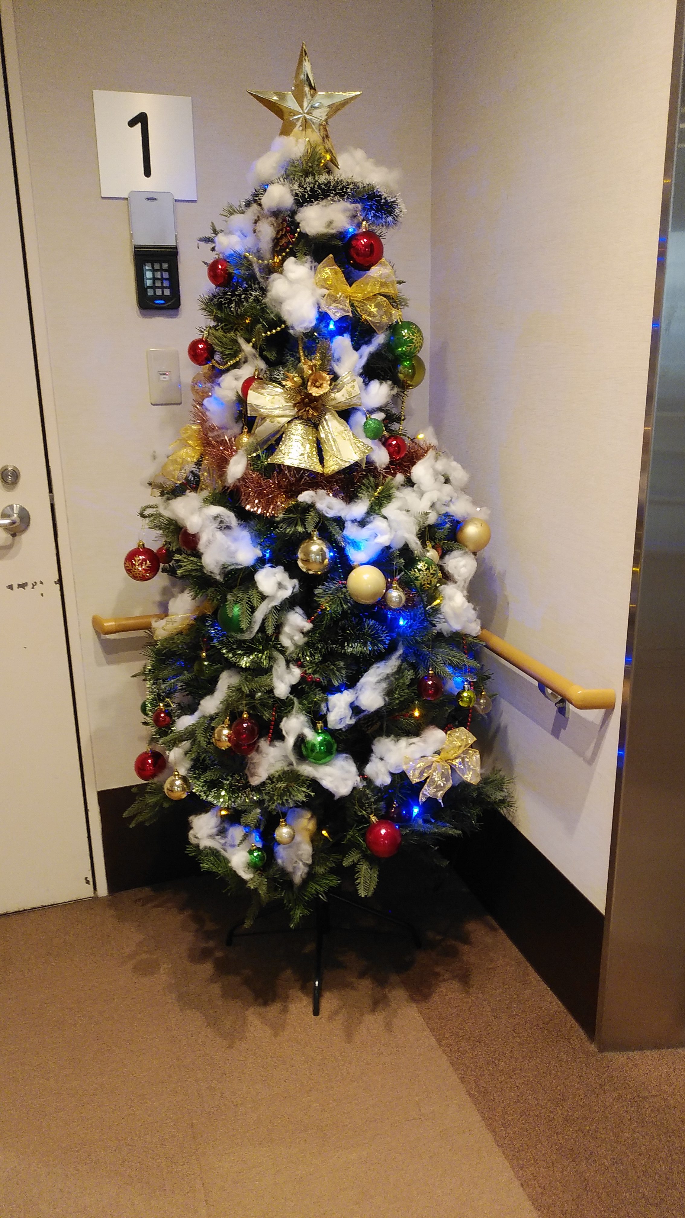 と、思いながら今日、エレベーターホールにクリスマスツリーを飾りました。
