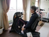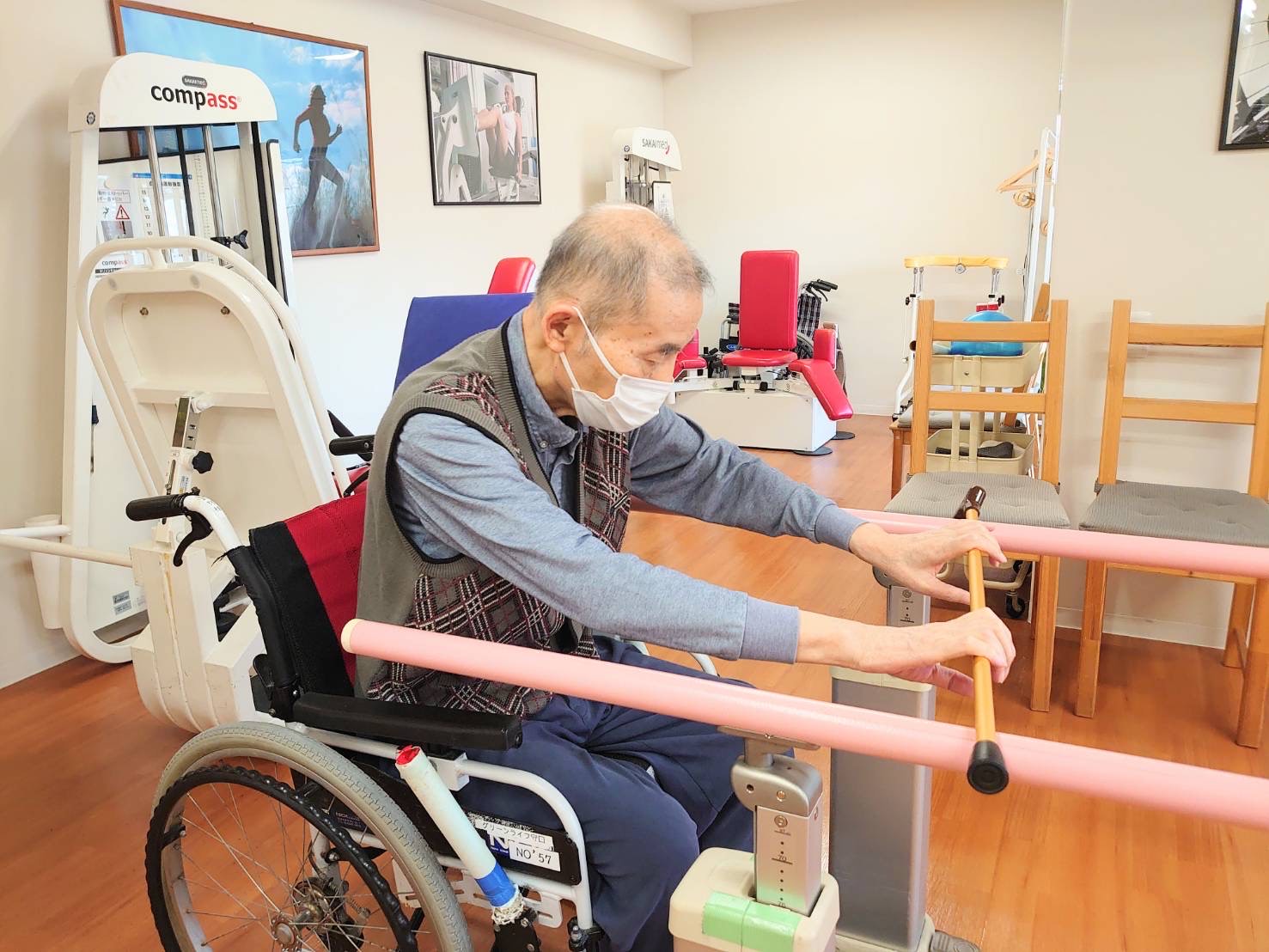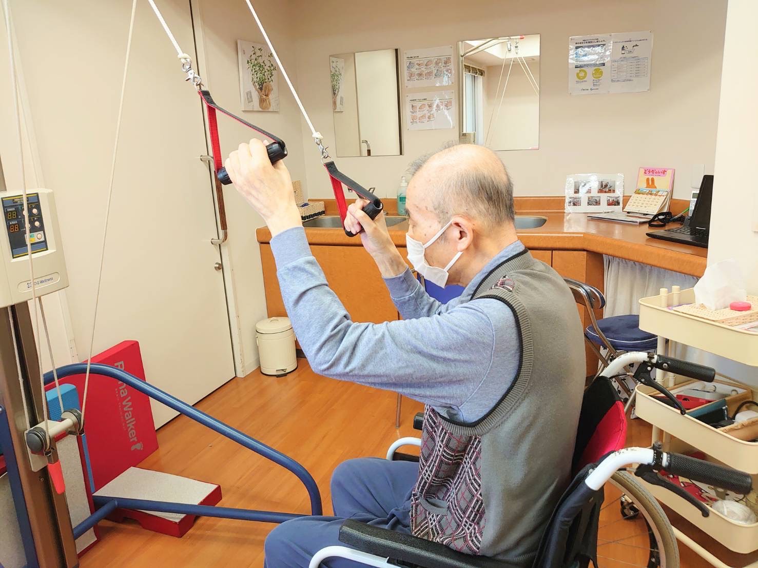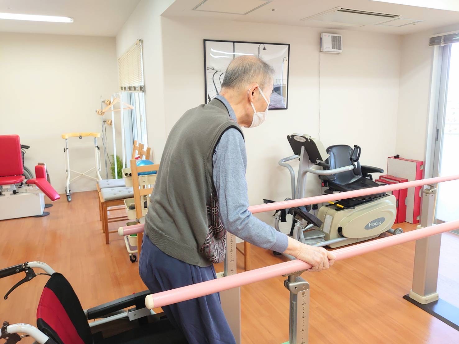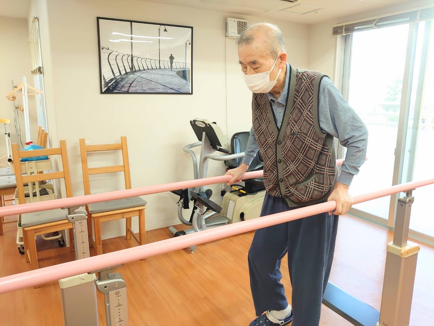 青空が見えますわ、入居者様は外の景色を眺めながら自主トレしています。