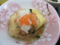 本日の昼食は きのこご飯・清まし汁・揚げ出し豆腐・小松菜ごま和え・フルーツ でした。