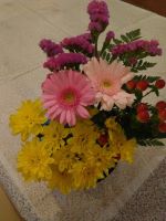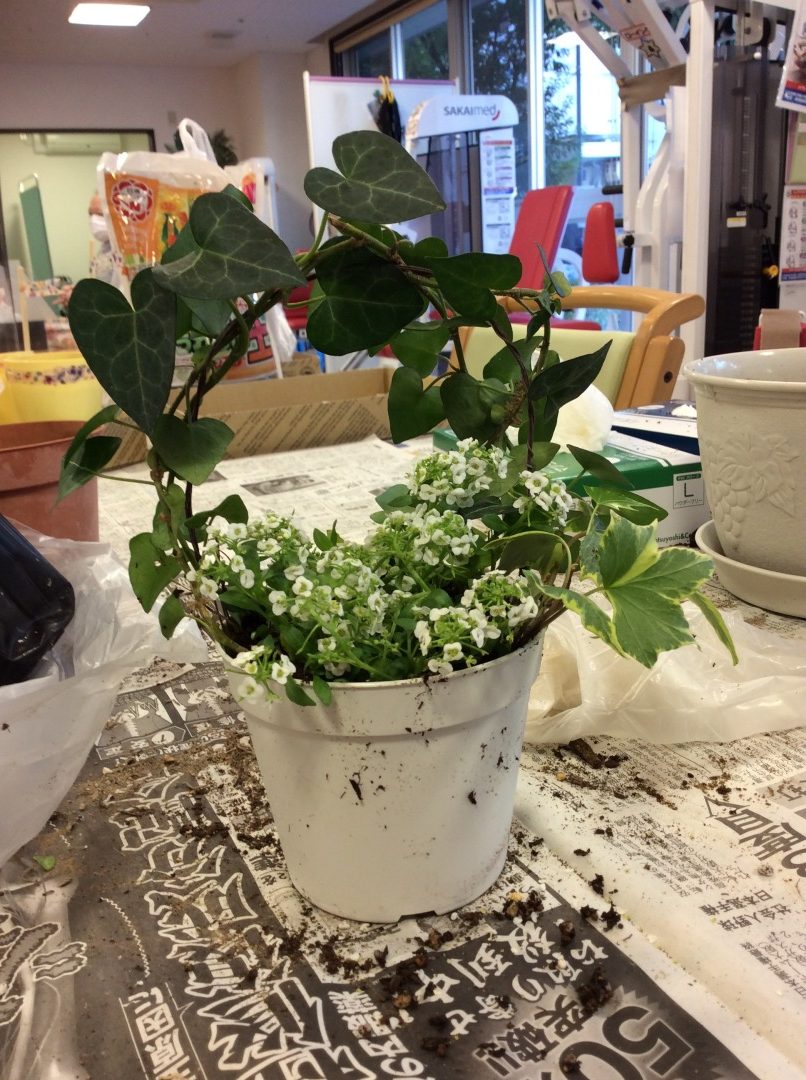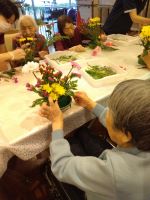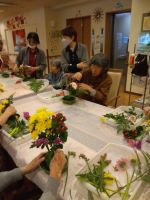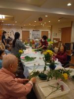 黄色のスプレーマムとピンクのガーベラをメインに,皆様活けていらっしゃいました。初参加の方も楽しそうに活けてくださり、素敵なアレンジメントが完成しました(^^♪