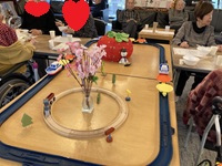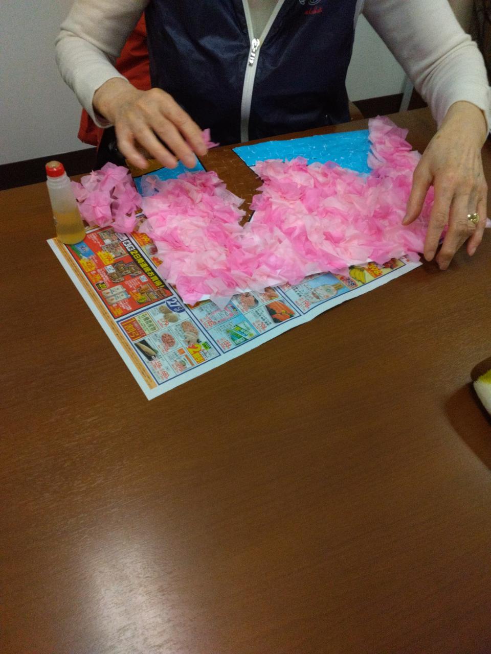 脳トレや、塗り絵、壁面では桜並木を皆様で頑張って制作されています。