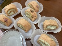 ロールケーキは、桜味。中の生クリームには、抹茶パウダーと白あんを練り込みました!!