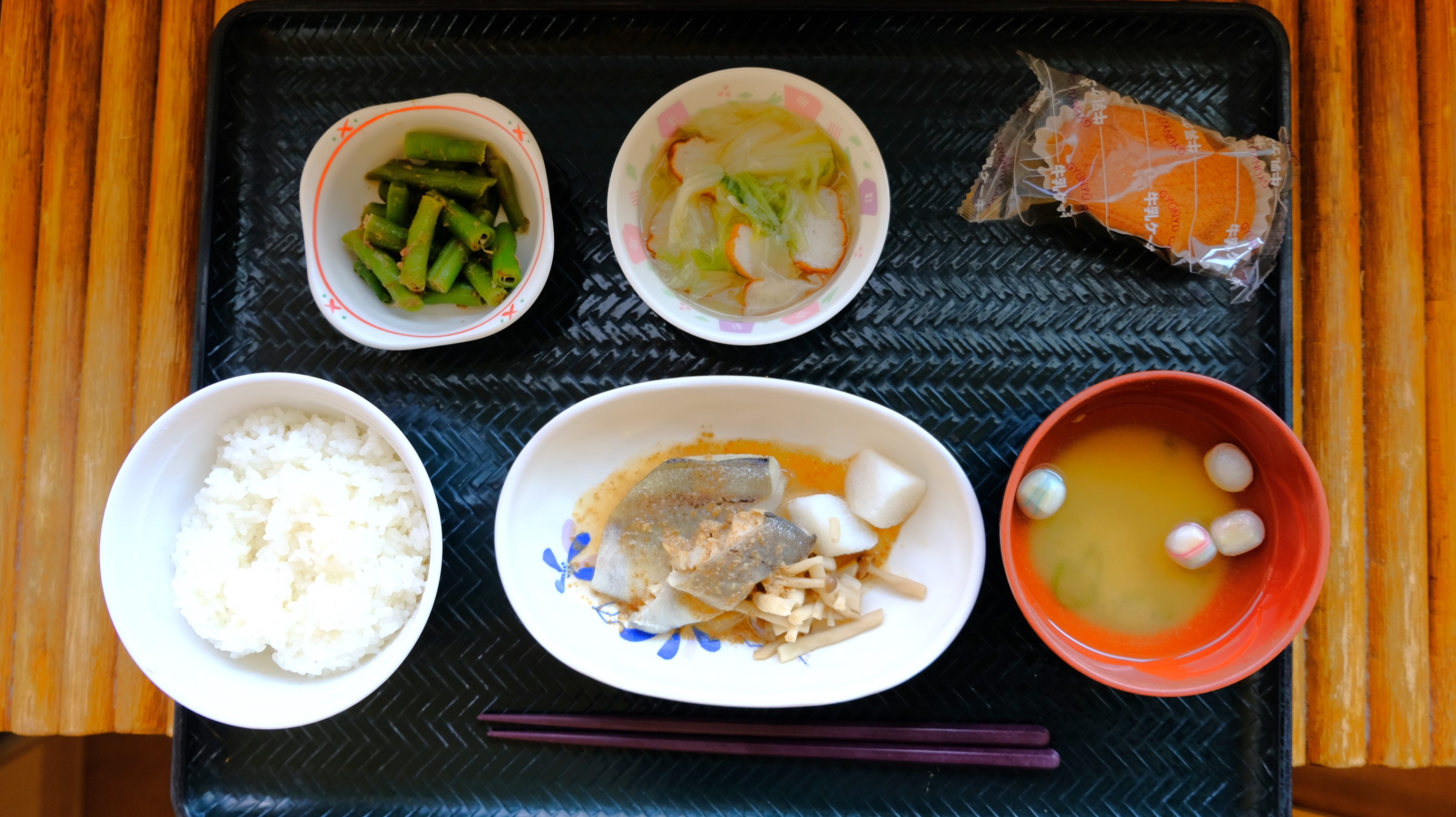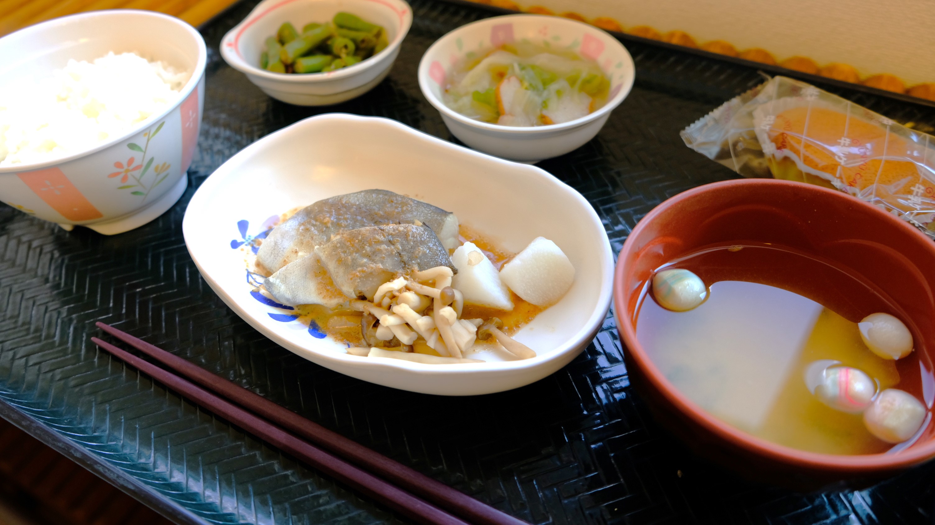 本日のお昼ご飯をご紹介します♪ 『たらの酒蒸し・白菜の煮物・いんげんのおかか和え・ごはん・味噌汁』の野菜たっぷりの和定食でした。体に優しい献立で皆様美味しそうに召し上がっておられました(*´▽`*)
