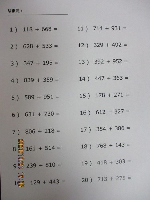明日の頭の体操の問題をご紹介します♪ こちらは3桁の足し算問題です。2桁までは簡単ですが3桁だと結構頭を使うのでとても良い脳のストレッチになります(*´▽`*)