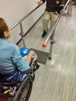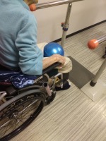 リハビリ中の休憩かなと思ったところ、横から覗くと足元にはボールを両膝の間に挟んでおり、まさにリハビリ最中でした。