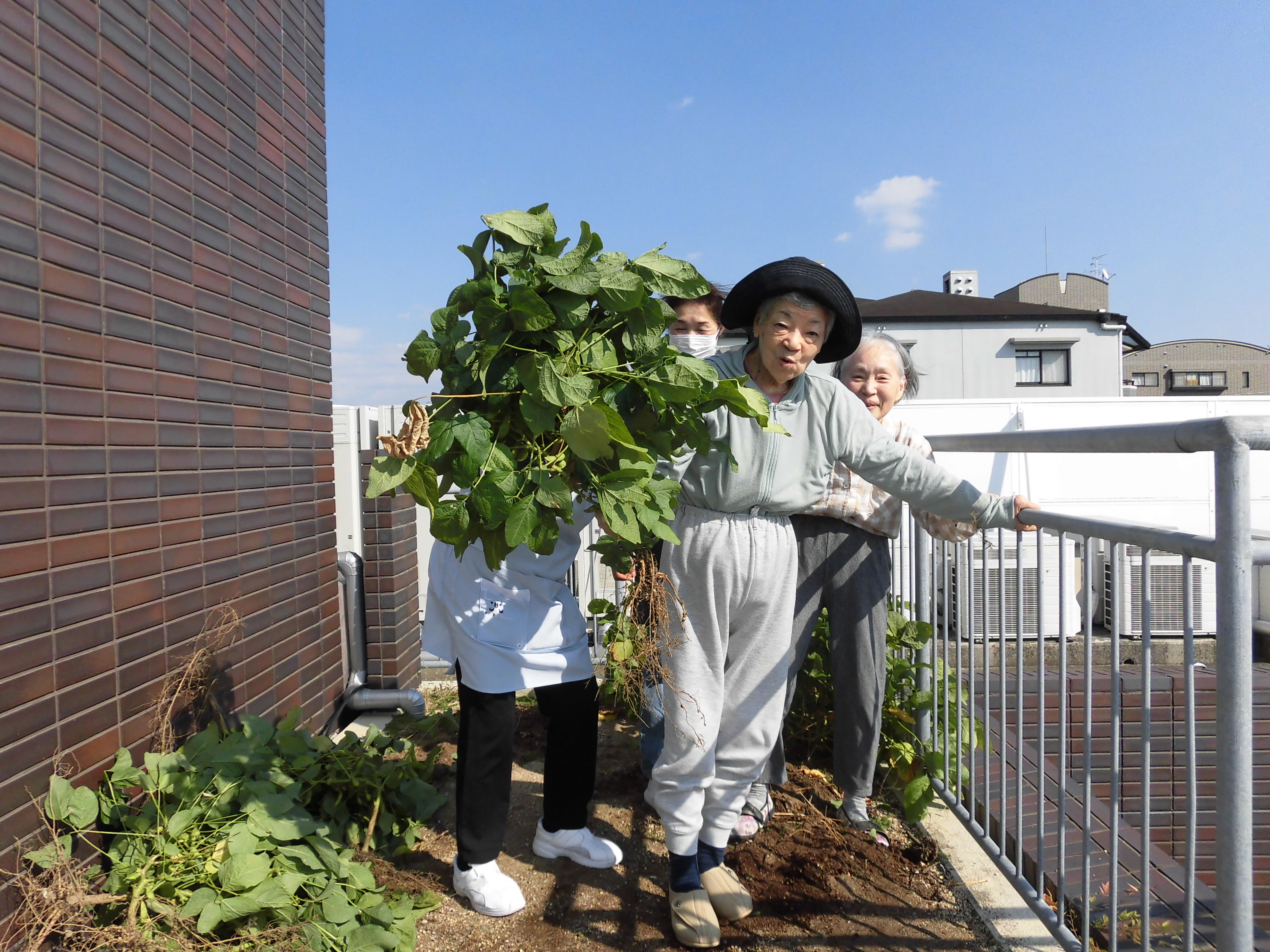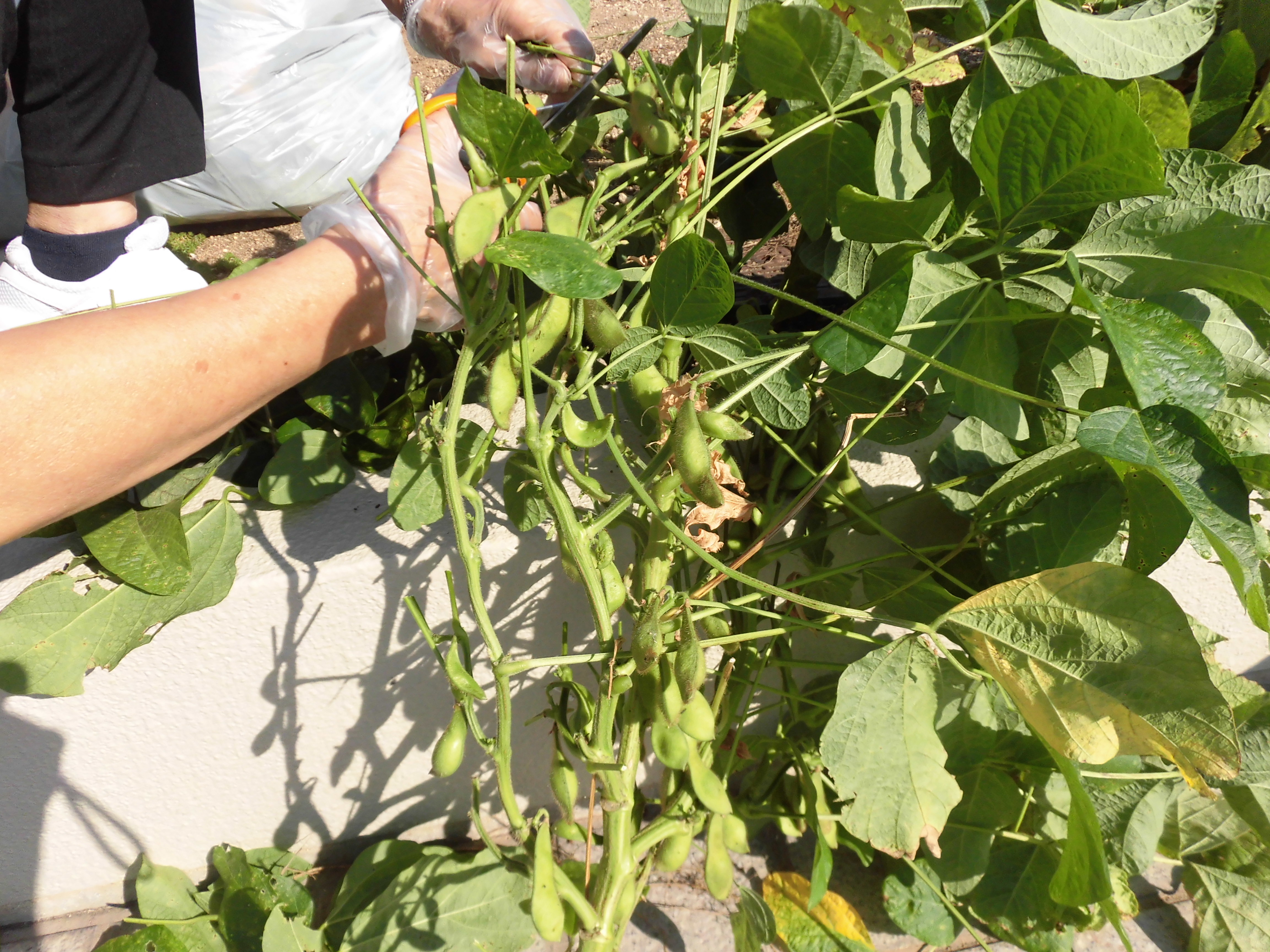 当施設の屋上庭園では枝豆が立派に育ち収穫時期になりました。