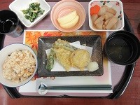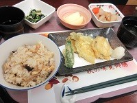 キノコたっぷりのご飯と、茄子やさつまいもなどの天ぷらなど