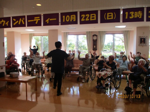 今日は『健康いきいき体操』を開催しました♪ リハビリの先生をお招きして音楽や先生のお声に合せて身体を動かしたり、お声を出したりして皆様とても張り切っておられました(*´▽`*)
