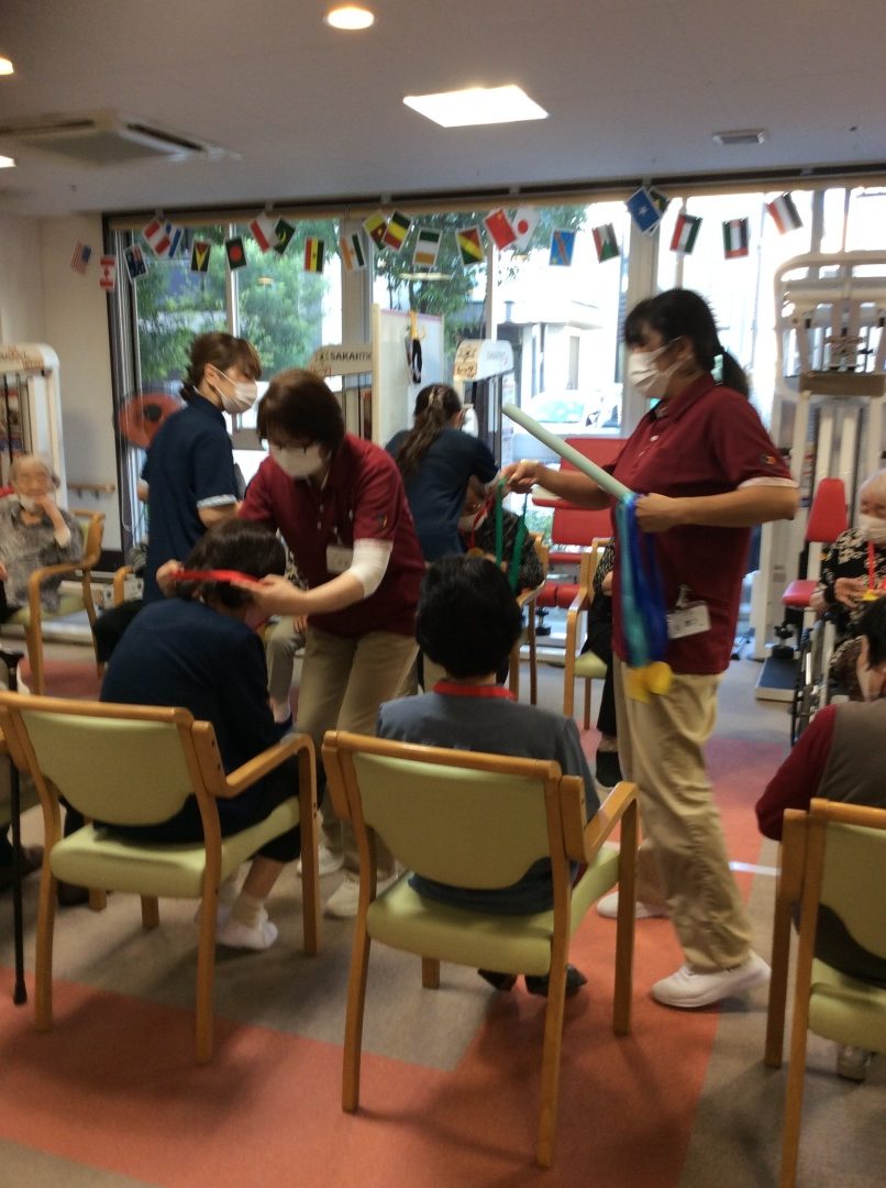 今日は『健康いきいき体操』を開催しました♪ リハビリの先生をお招きして音楽や先生のお声に合せて身体を動かしたり、お声を出したりして皆様とても張り切っておられました(*´▽`*)