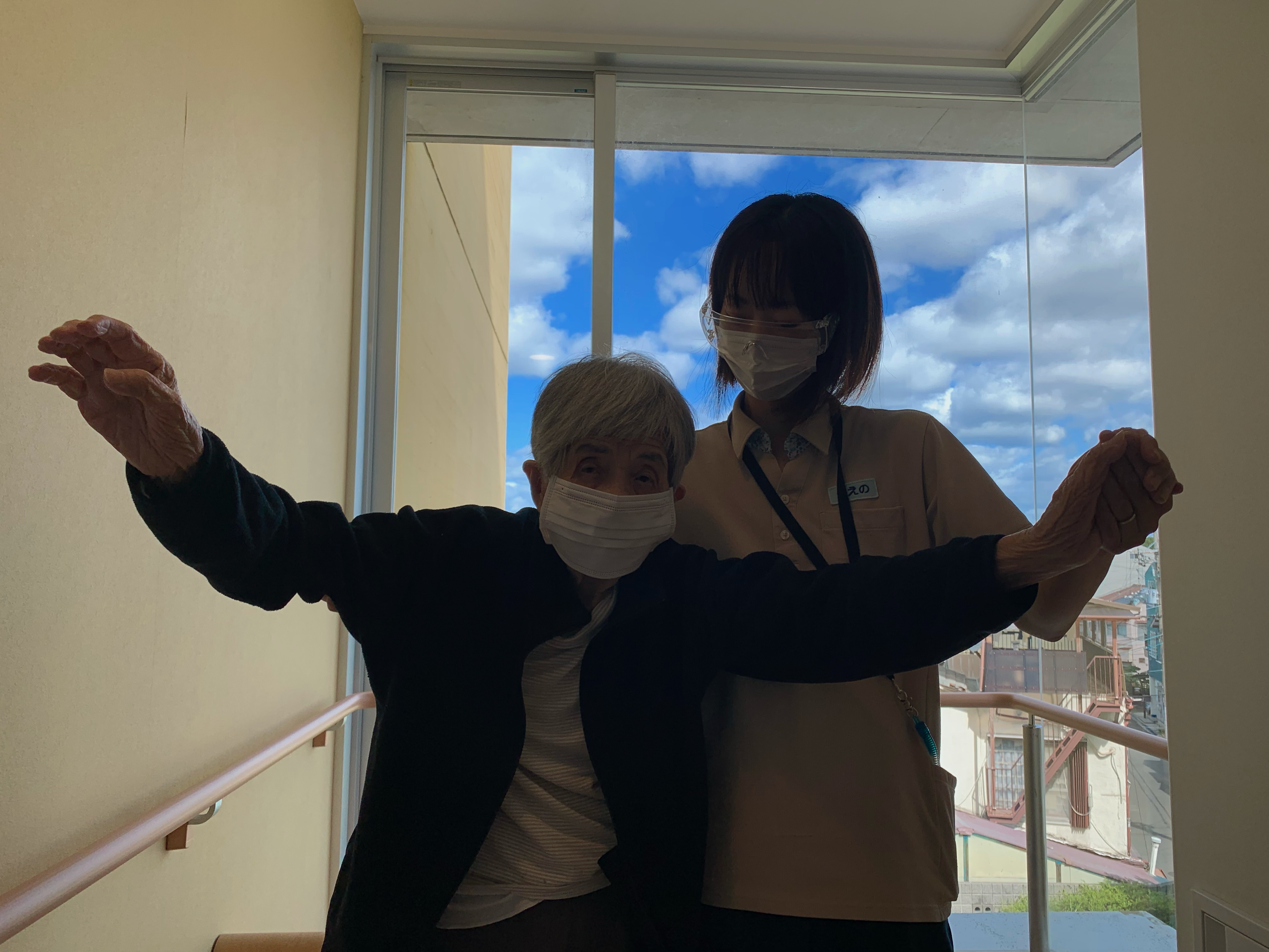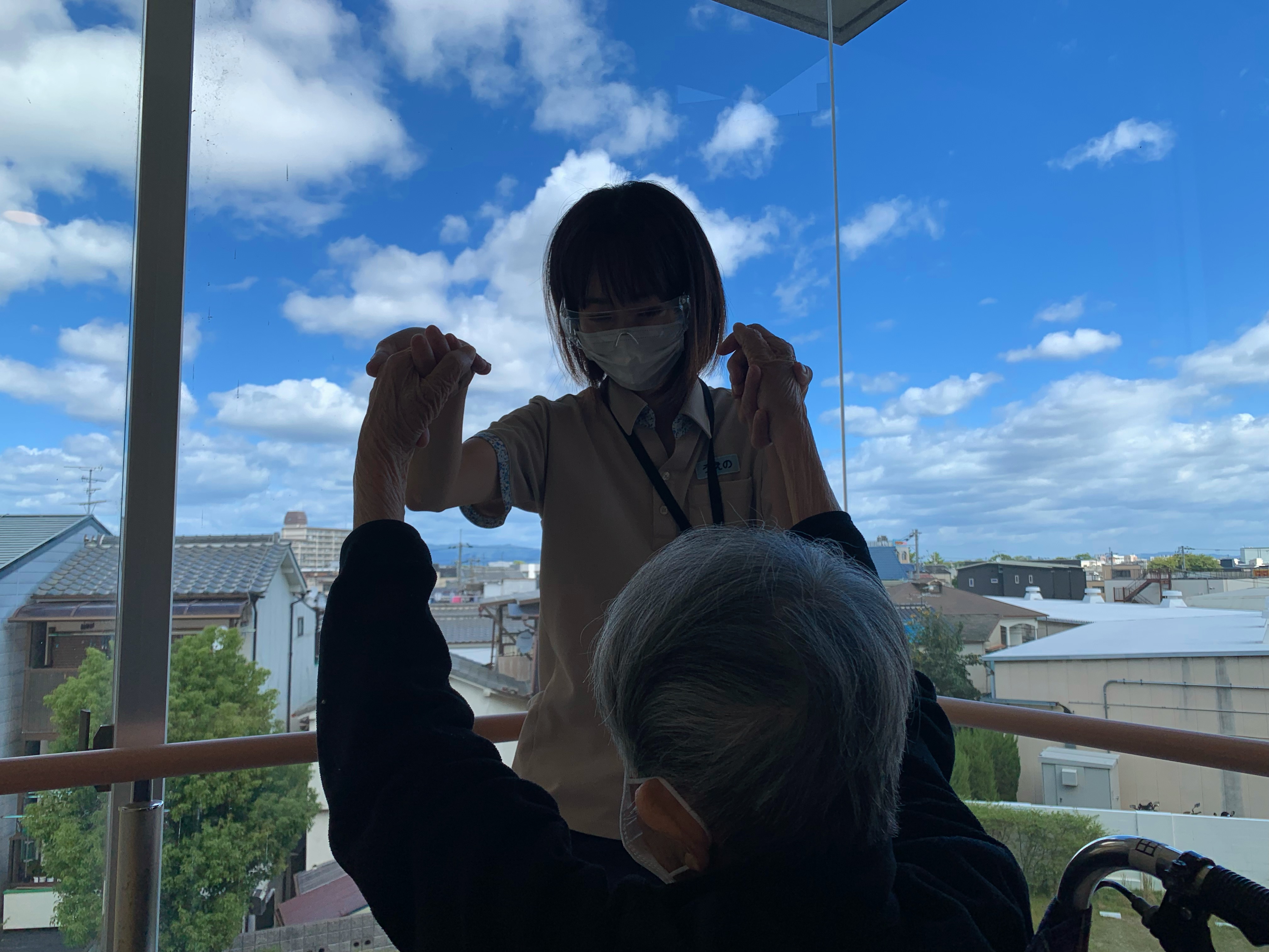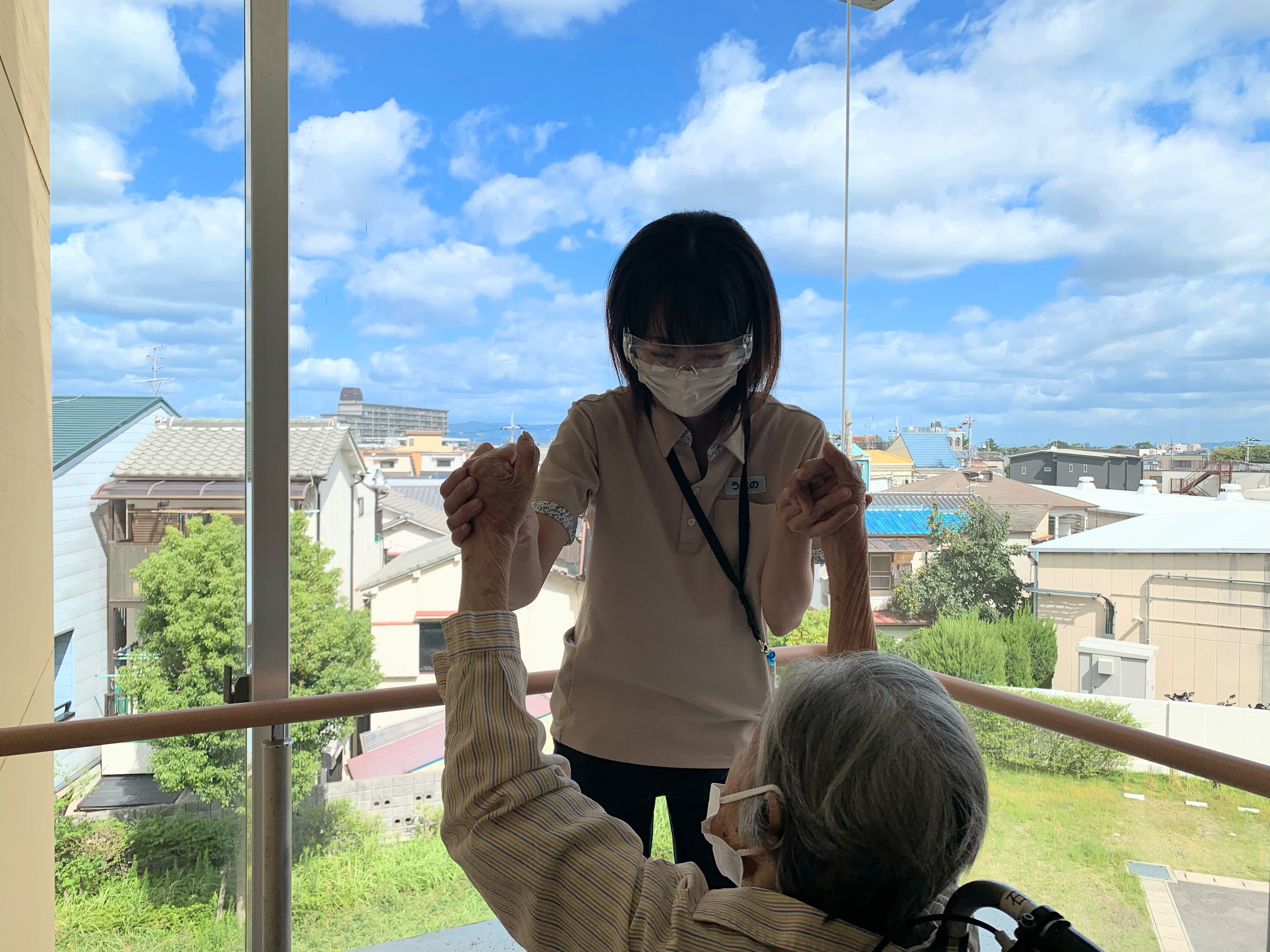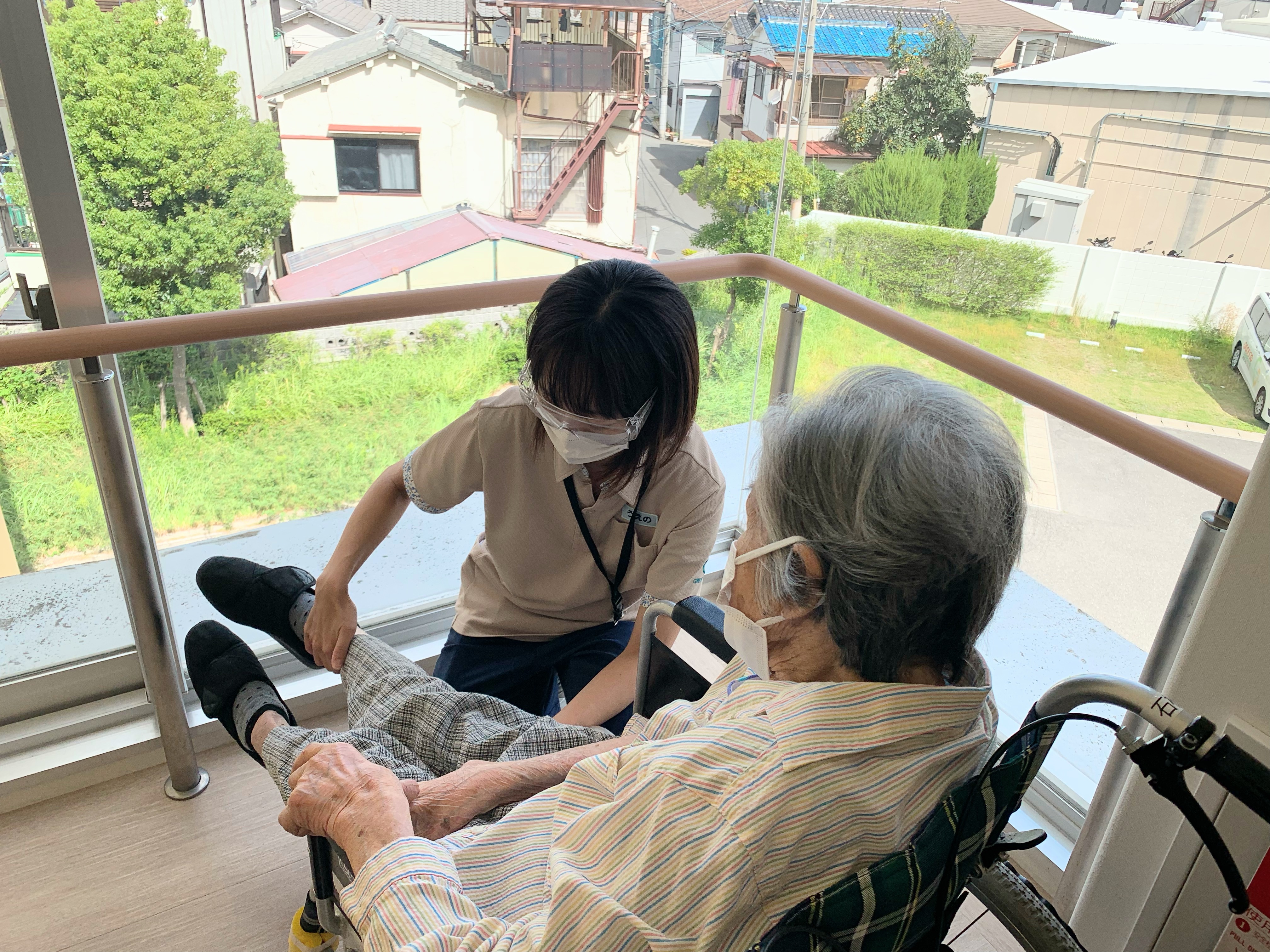車イス利用されている入居者様、普段は歩行訓練で並行棒内で立ち上がりなどを訓練しますが、過ごしやすい天候ということで中庭で日光浴(陽射しはありませんが)をされました。