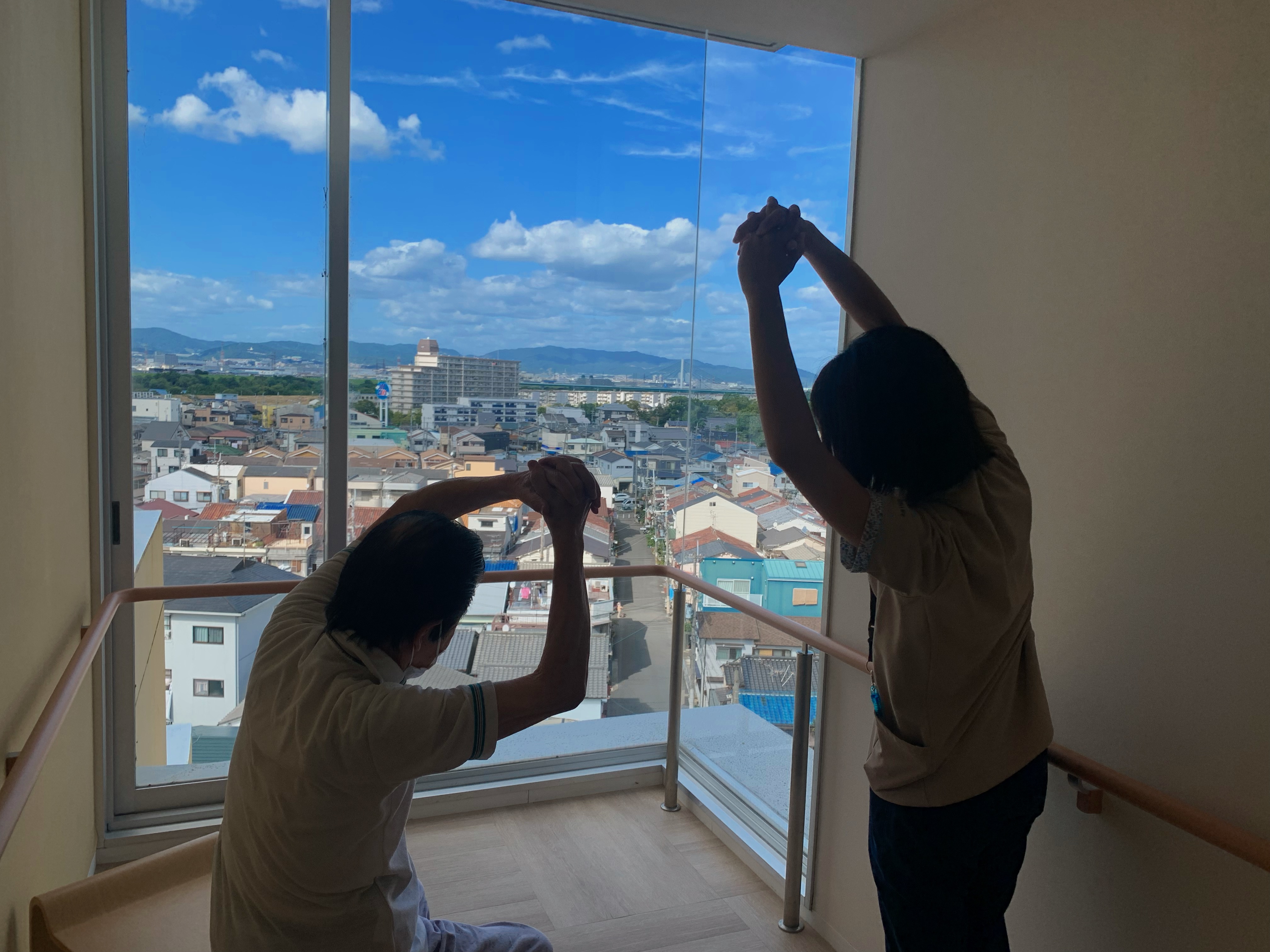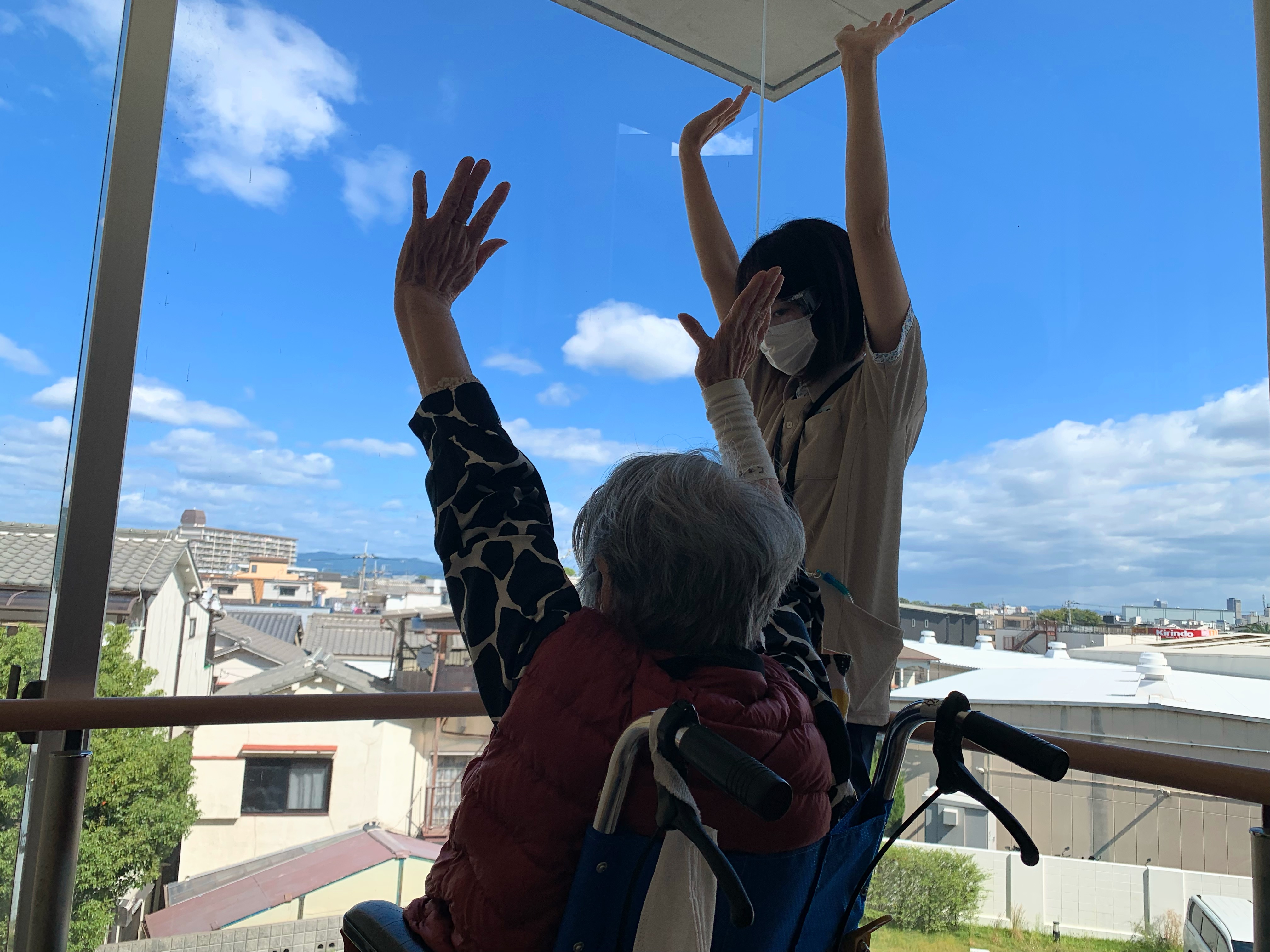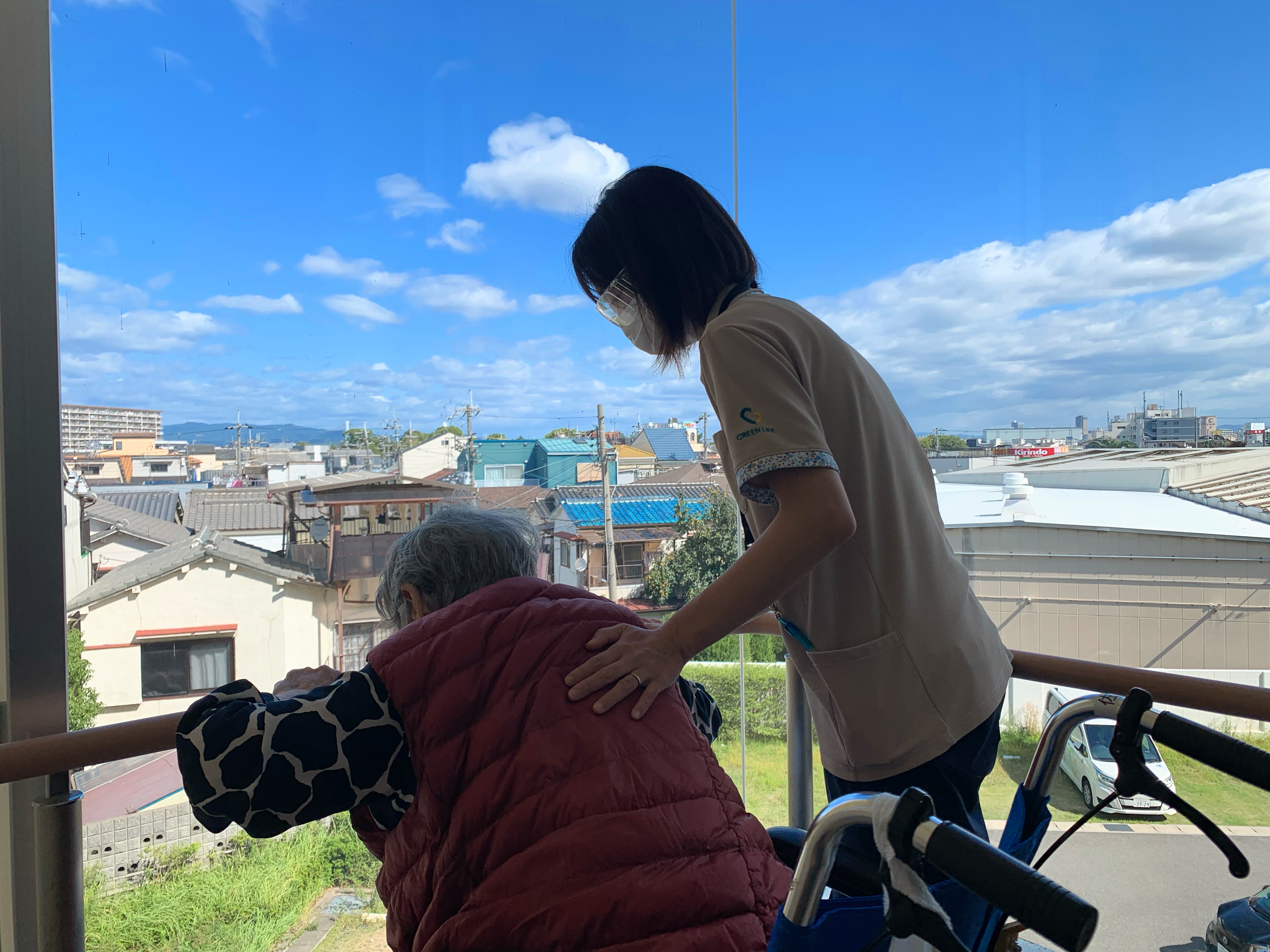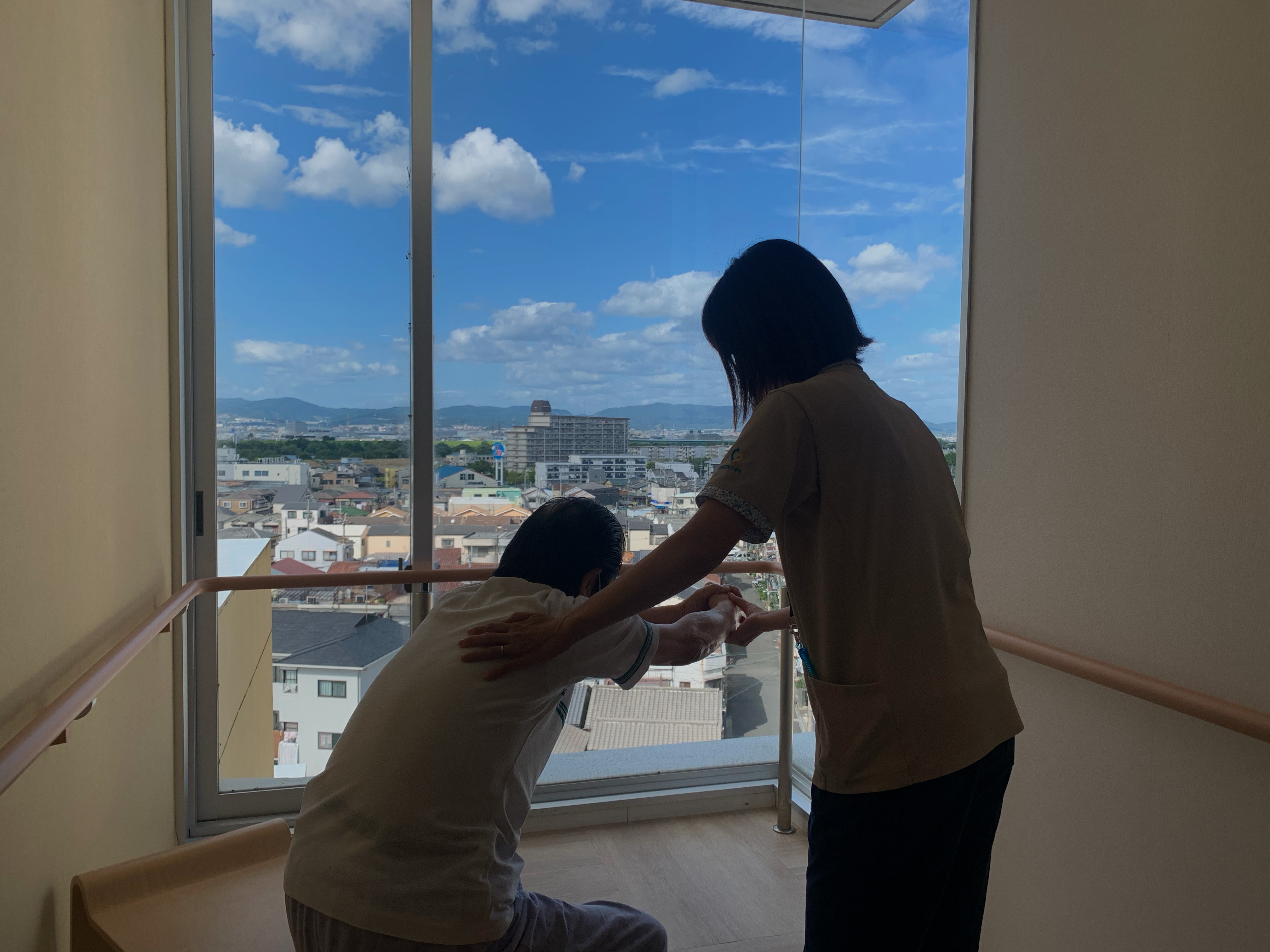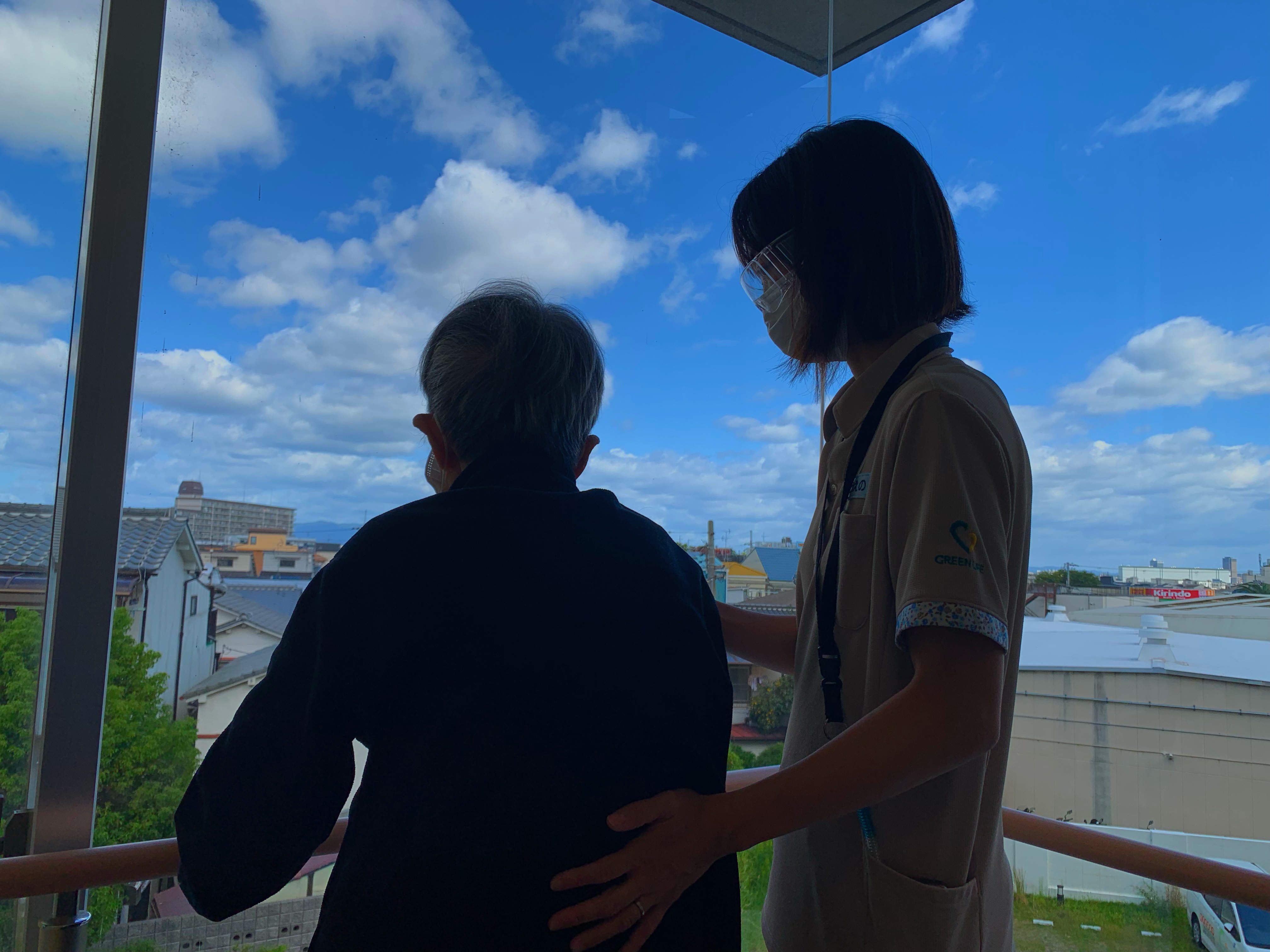 車イス利用されている入居者様、普段は歩行訓練で並行棒内で立ち上がりなどを訓練しますが、過ごしやすい天候ということで中庭で日光浴(陽射しはありませんが)をされました。
