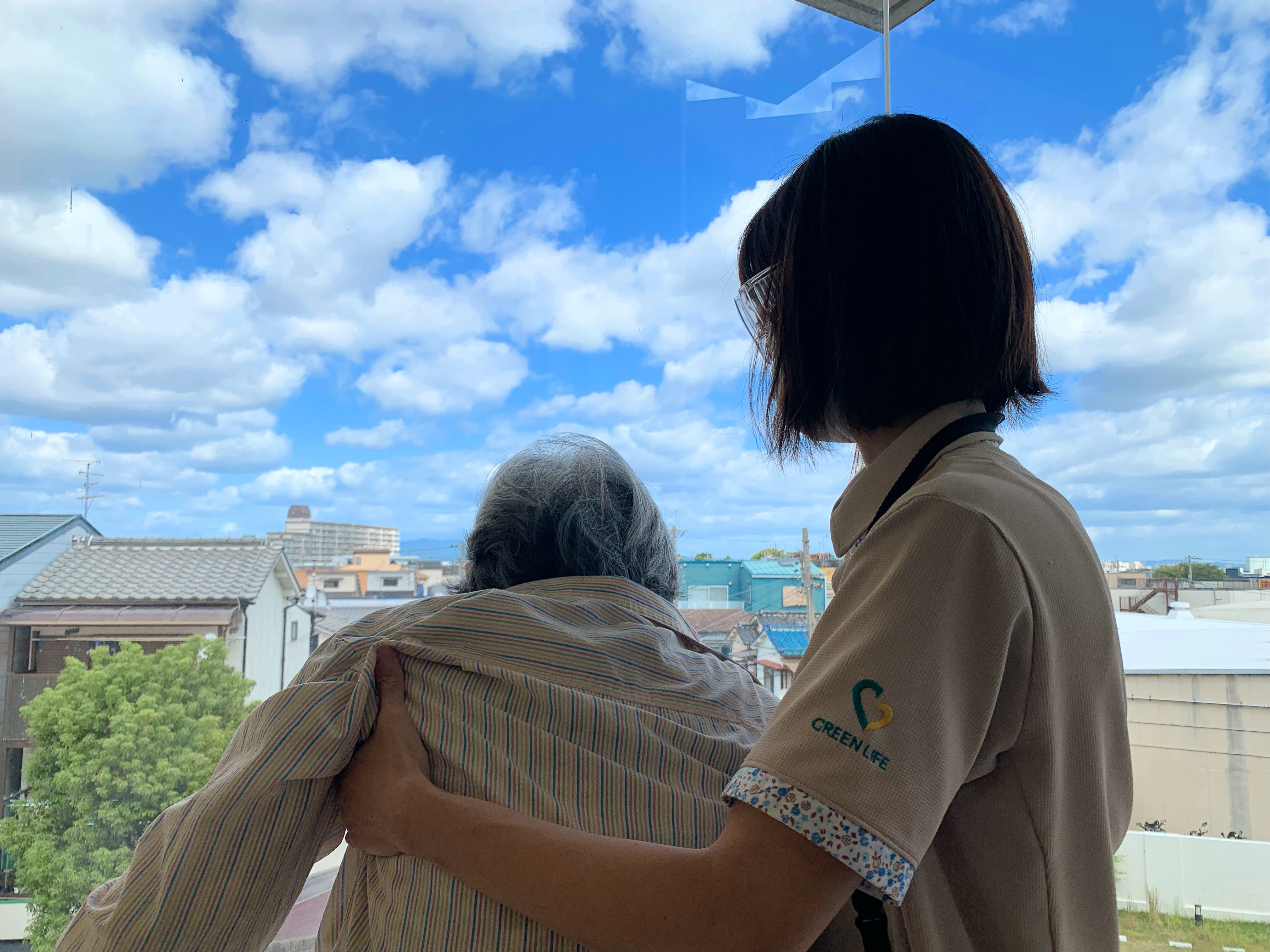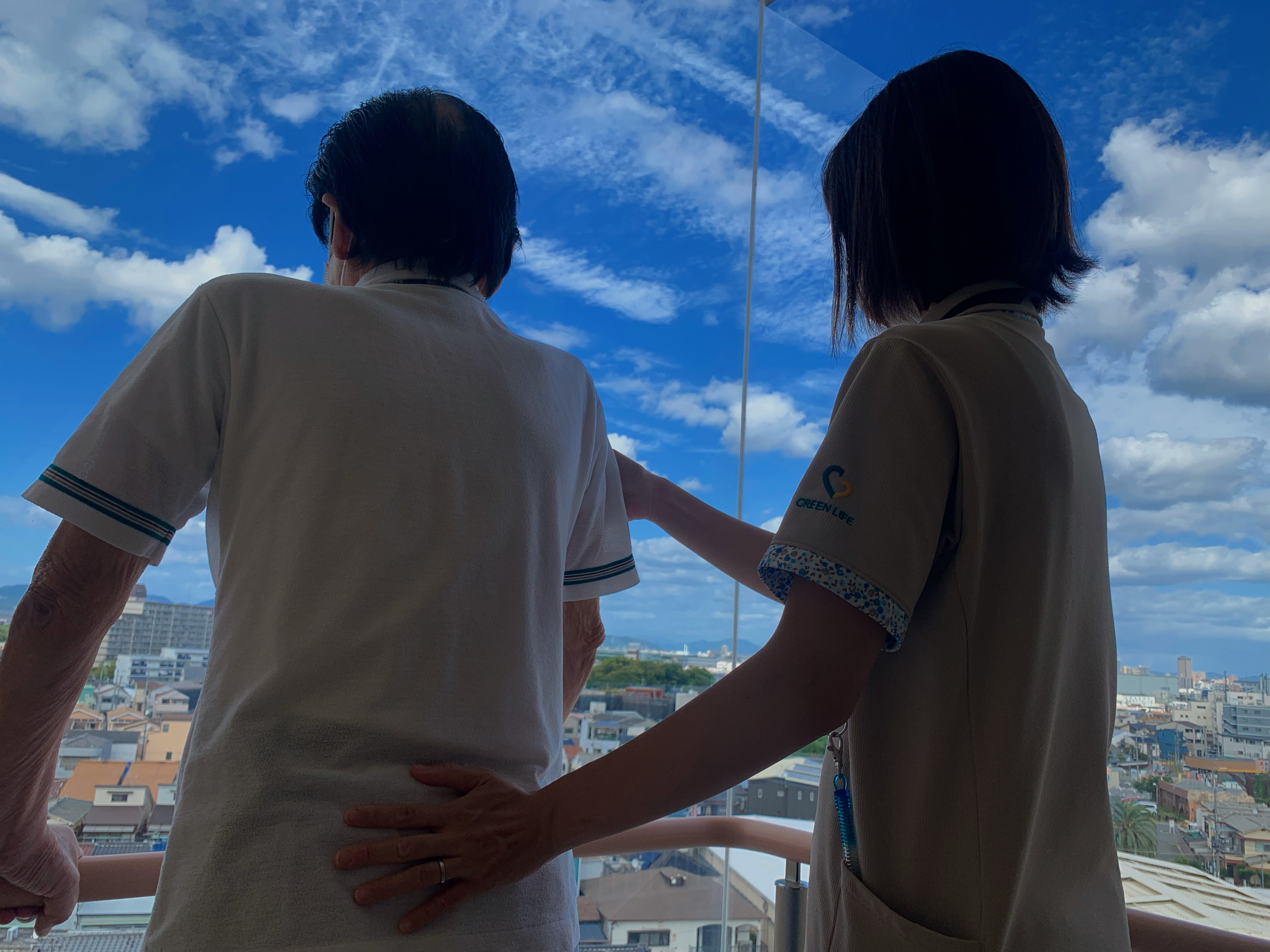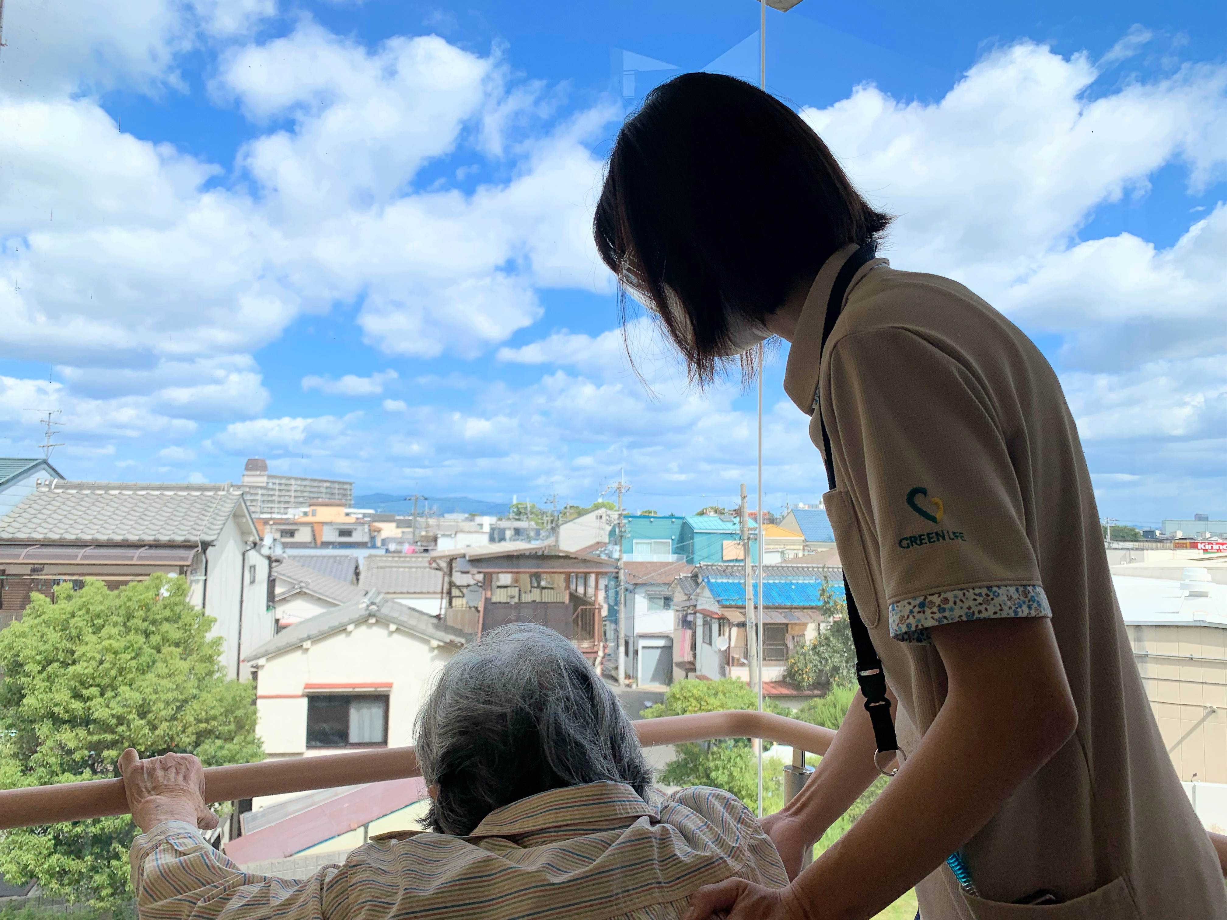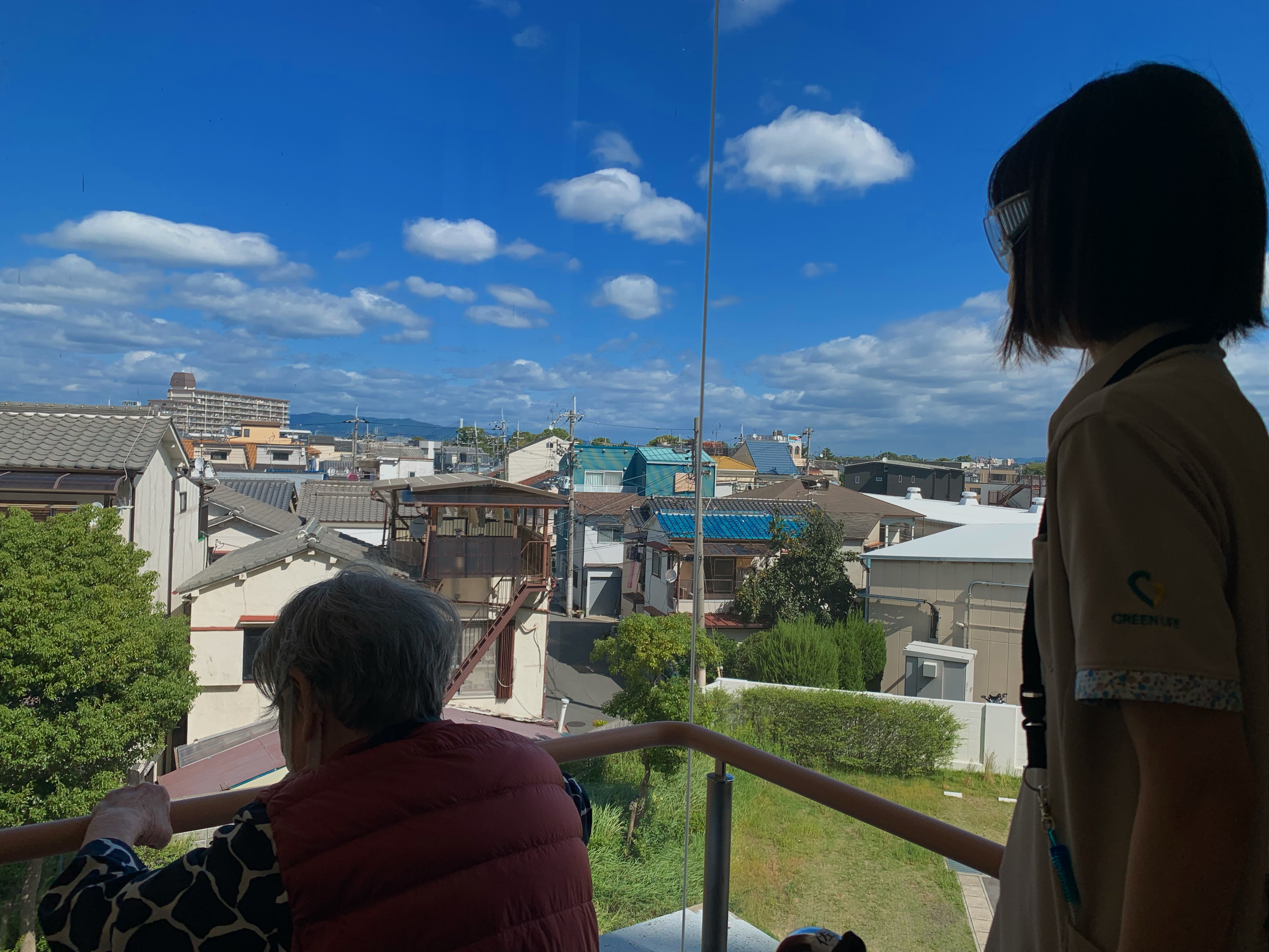 車イス利用されている入居者様、普段は歩行訓練で並行棒内で立ち上がりなどを訓練しますが、過ごしやすい天候ということで中庭で日光浴(陽射しはありませんが)をされました。