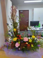 葉🍂も添えられていて秋らしいアレンジメントです。赤い実は何に見えますか?どうしても「ミニトマト🍅」にしか見えないのですが「花ナス」だそうです。先生のアレンジメントを楽しみにされているご家族様も「珍しいわ」と鑑賞されていました。