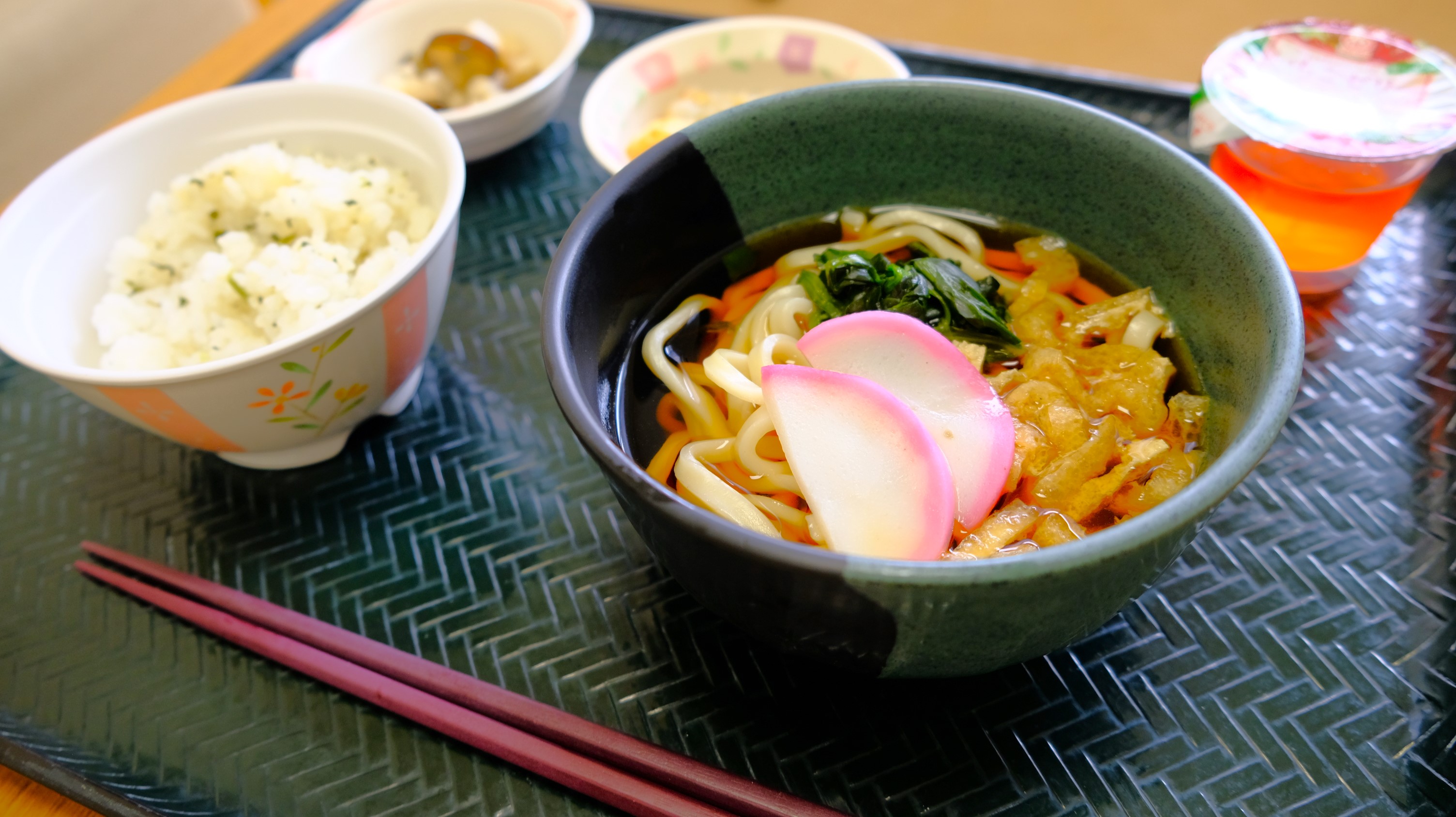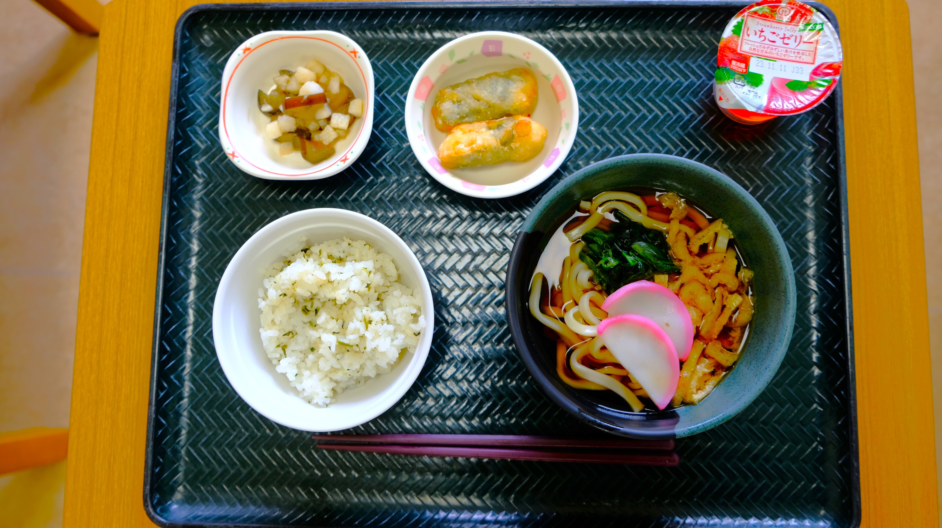 献立のメニューは、チキンカレーとグリーンサラダ、フルーツ付きです。